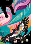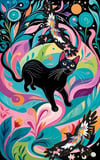 Black cat with doves vibrant colors