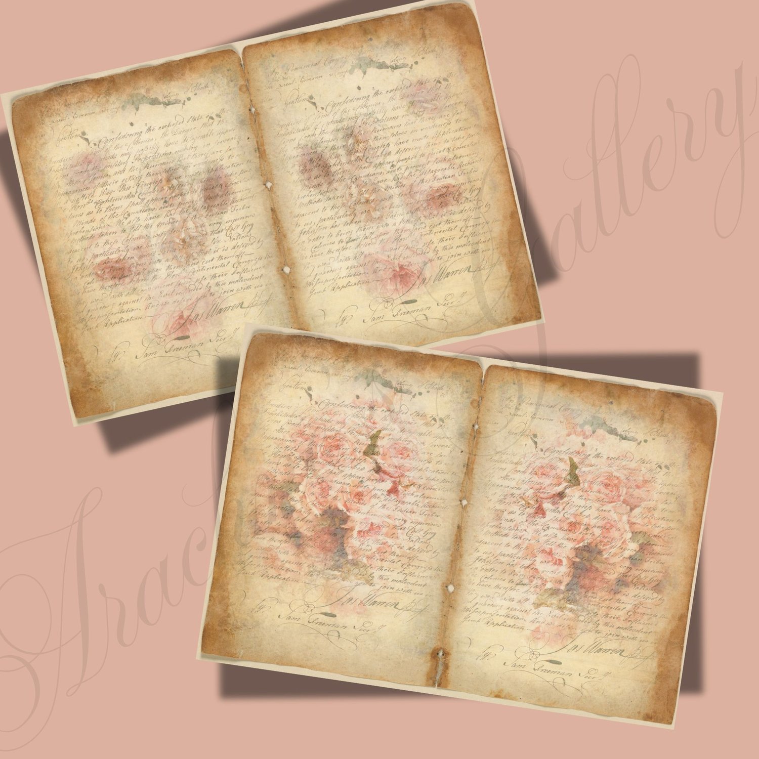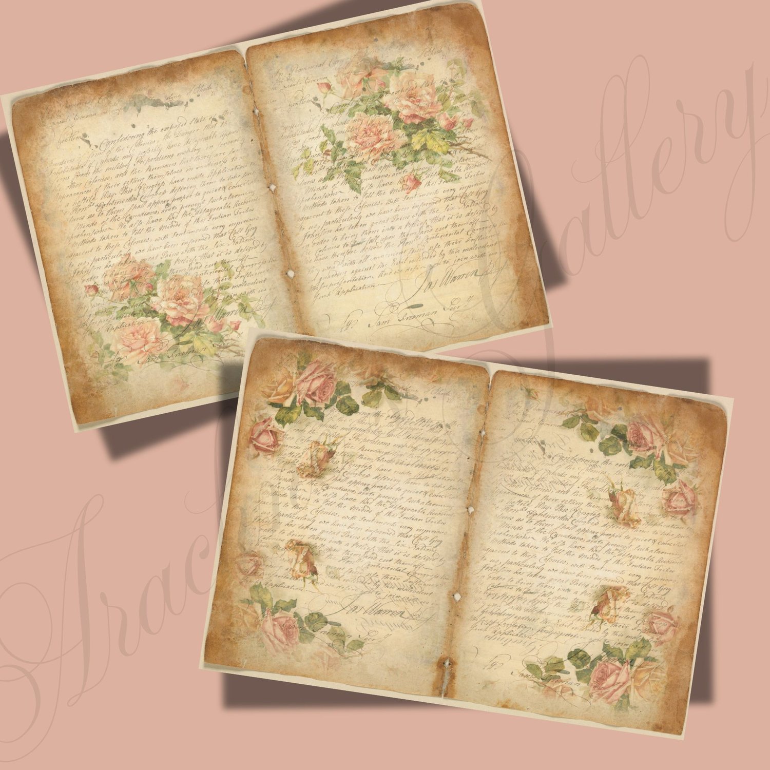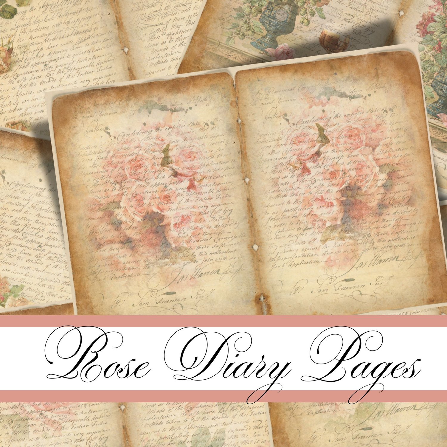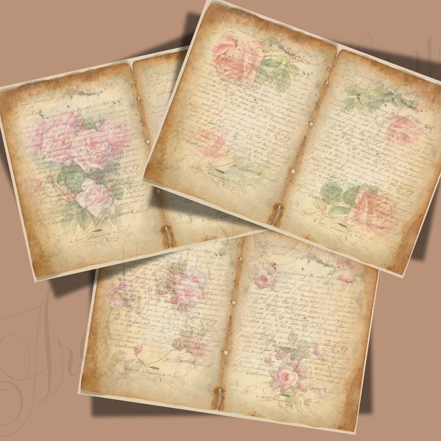 This set of junk journal pages look like they're from an old diary. Roses peeking through the old handwriting give the idea of flowers or flower petals pressed between the pages. Use these pages for junk journaling, scrapbooking, decoupage, etc.