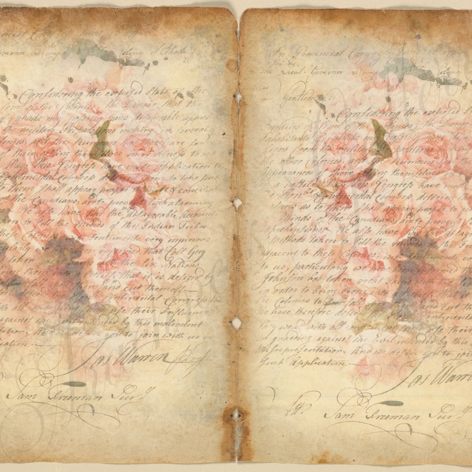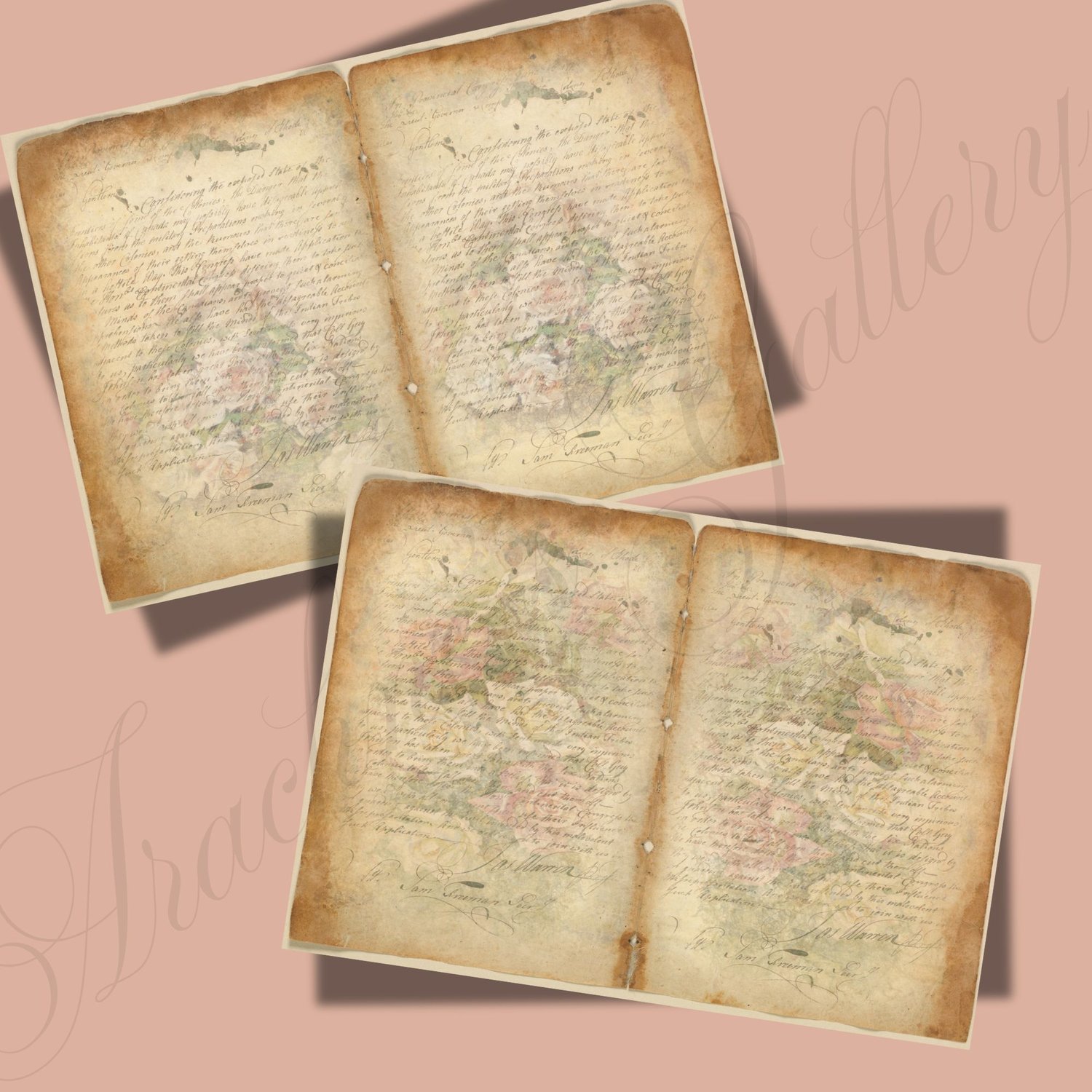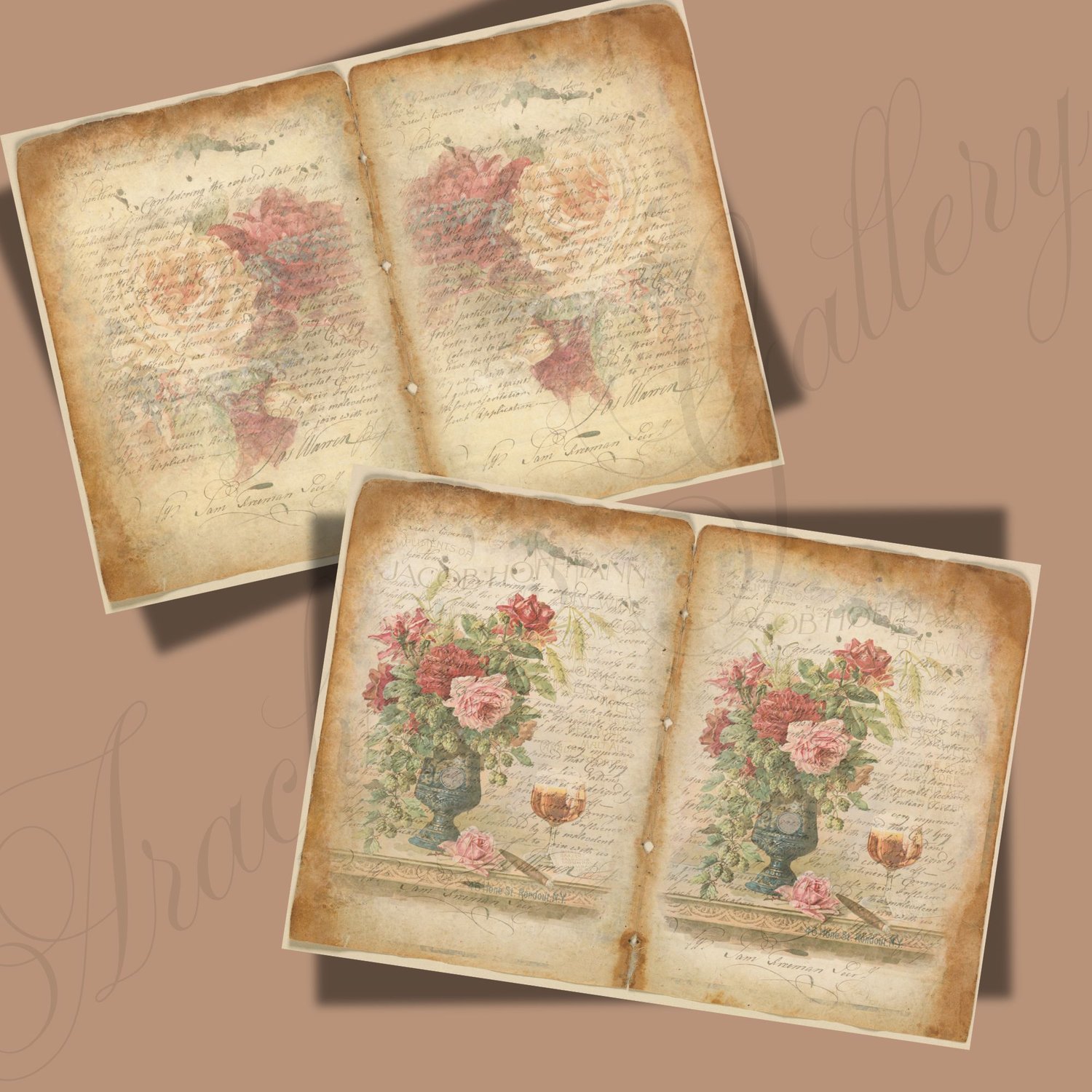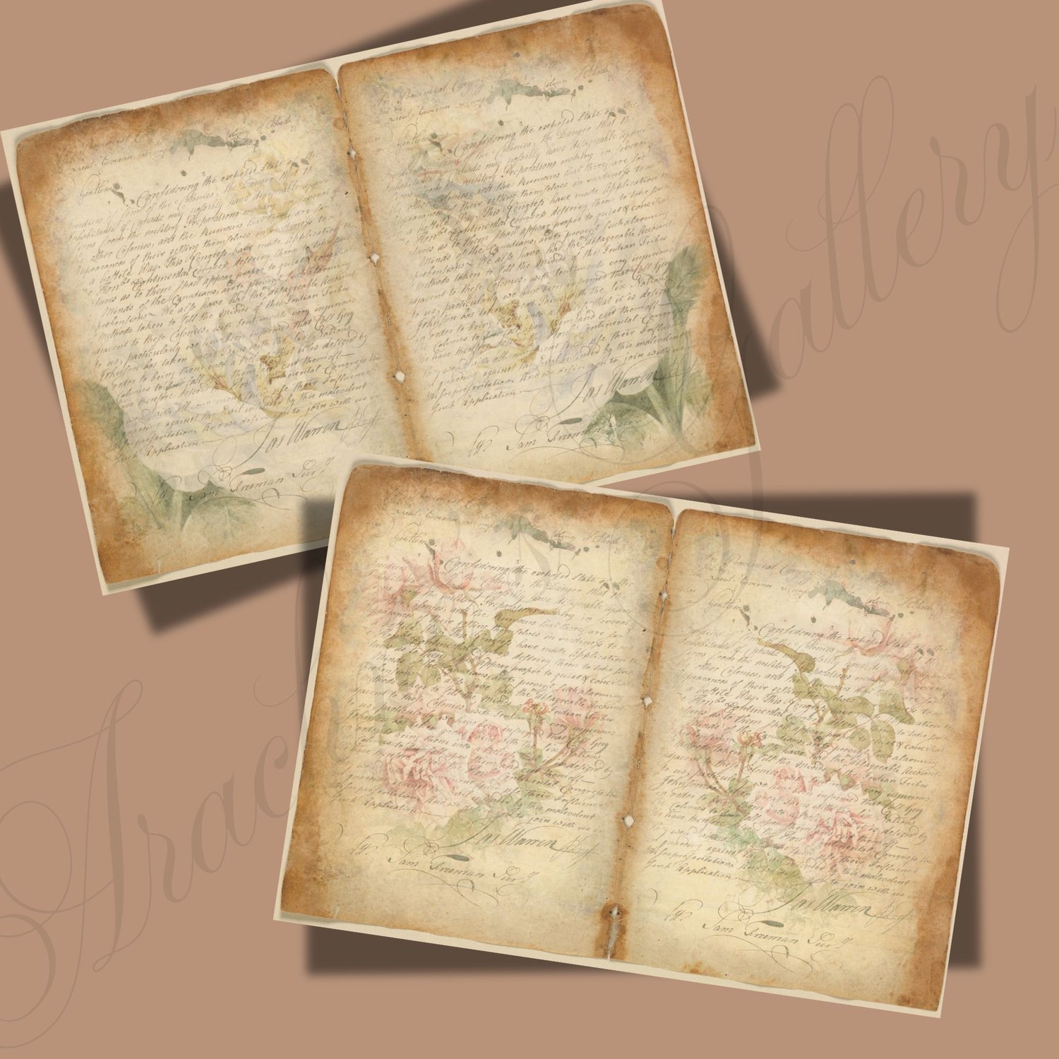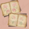 This set of junk journal pages look like they're from an old diary. Roses peeking through the old handwriting give the idea of flowers or flower petals pressed between the pages. Use these pages for junk journaling, scrapbooking, decoupage, etc.