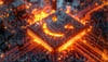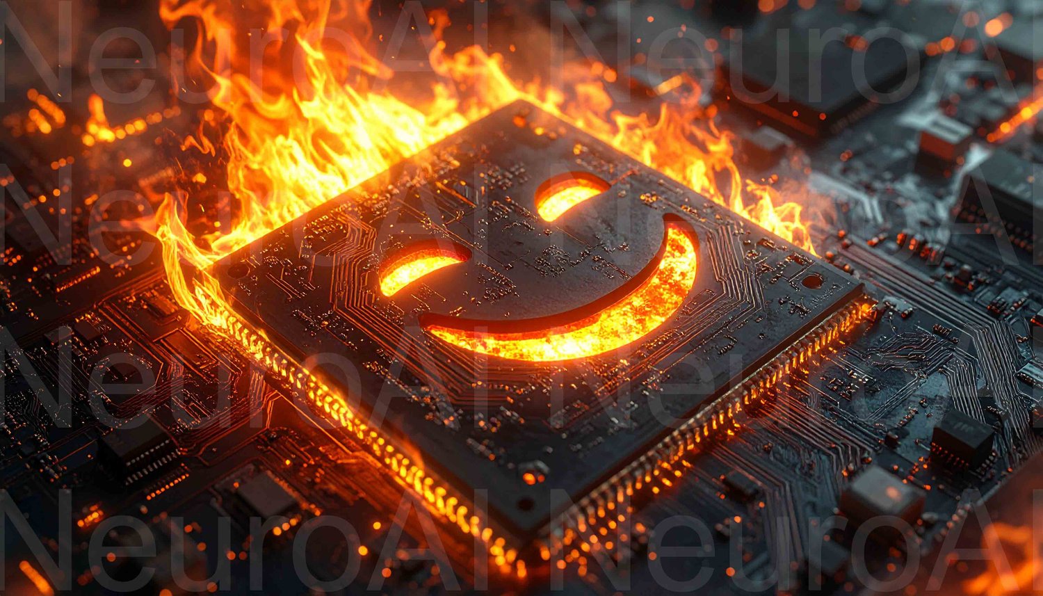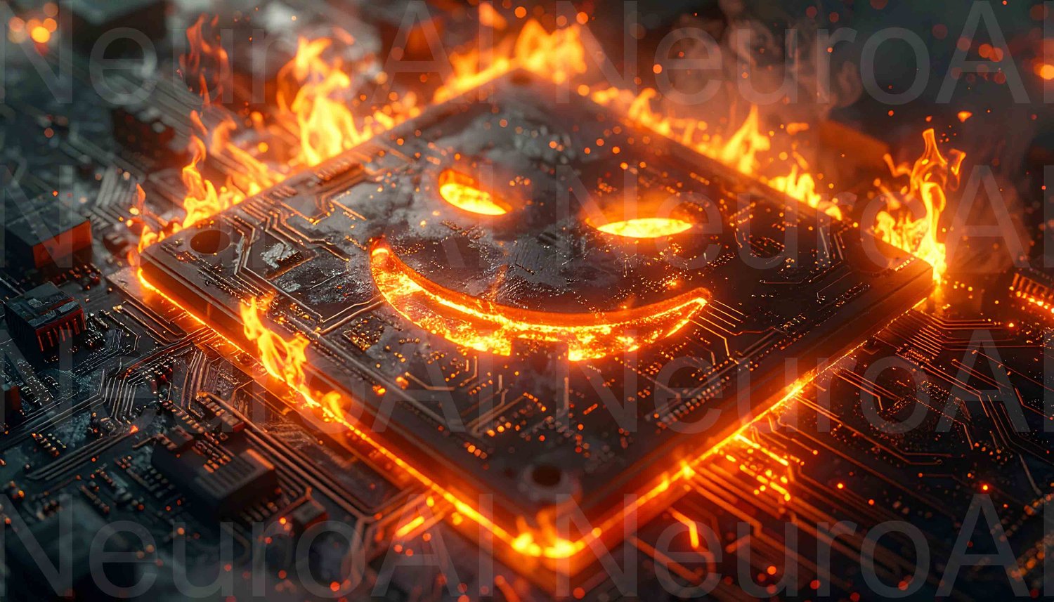 Burning circuit board with a sinister smiling face