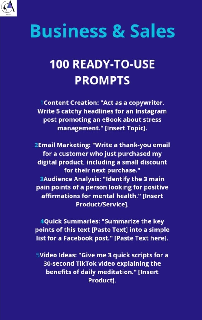 This eBook is a curated collection of 100 high-conversion, professional prompts designed specifically for entrepreneurs, creators, students, and professionals who want to work smarter, not harder.