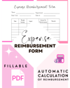 Expense Reimbursement Log Printable Form - Template with automatic calculation Fillable PDF - Expense Report Summary