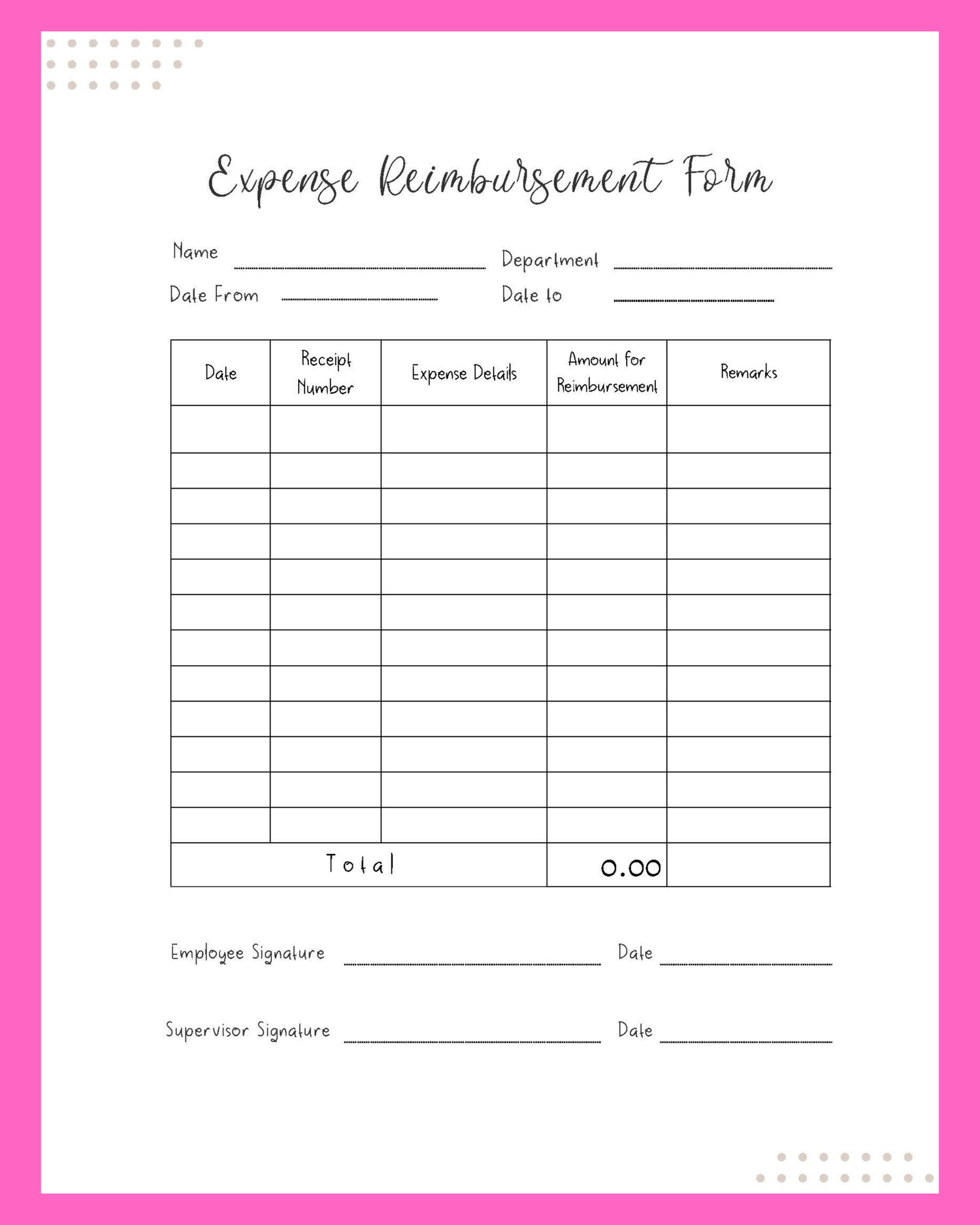 Use this Expense Log Template Fillable PDF Form. This PDF Printable form comes with auto-sum function to automatically get your total expenses for reimbursement.