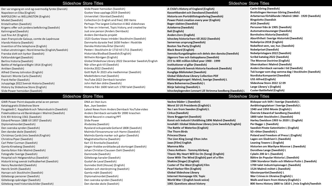 Pris är 5 USD + Moms 25 % och filformat är PPT. (Power Point) vilket kan ändras och nya bilder eller ändringar kan införas. Praktiskt för utbildning som kan anpassas för nya behov eller strategier. Klicka på länken för att ladda hem bildspel med olika bokstäver A till Ö som första bokstav i en given titel. Vill man bara ladda hem titlar som börjar med A går det bra. Vill man bara ladda hem ett bildspel och har titeln, skriv in i butikens sökruta och ladda hem från butiken. Samma pris 5 USD + Moms 25 %. Den totala samlingen har utökats med flera tusen nya bildspel under åren 2022 till 2026.