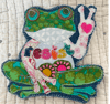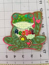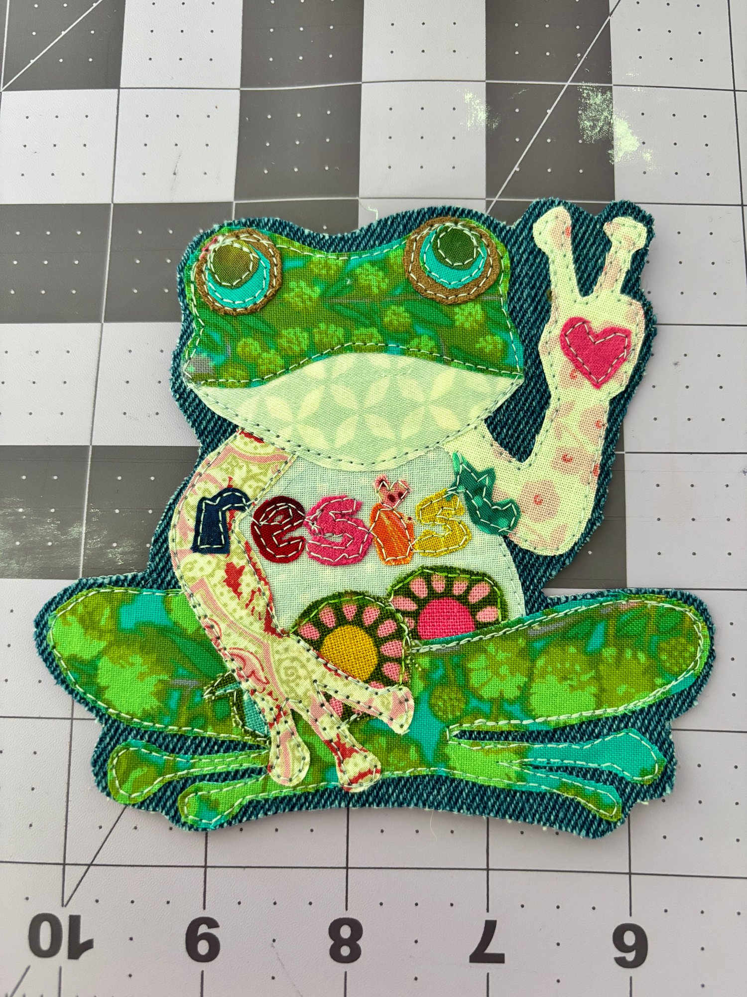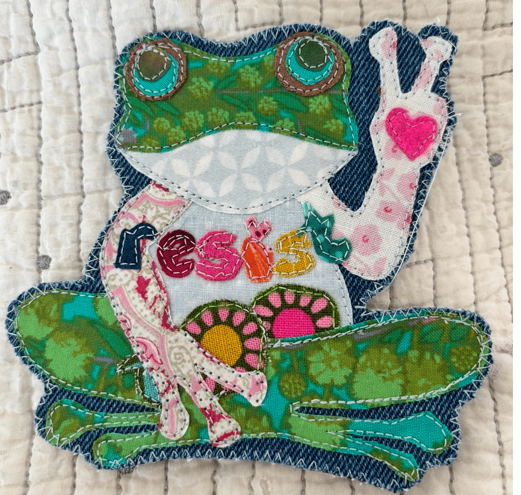 Meet the resist frog — a fabric appliqué patch that's equal parts funky and fierce. This little guy is made from layers of bright patterned fabrics and stitched together with a whole lot of personality.