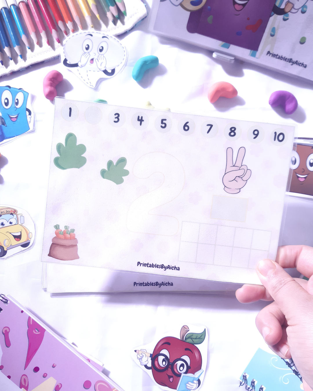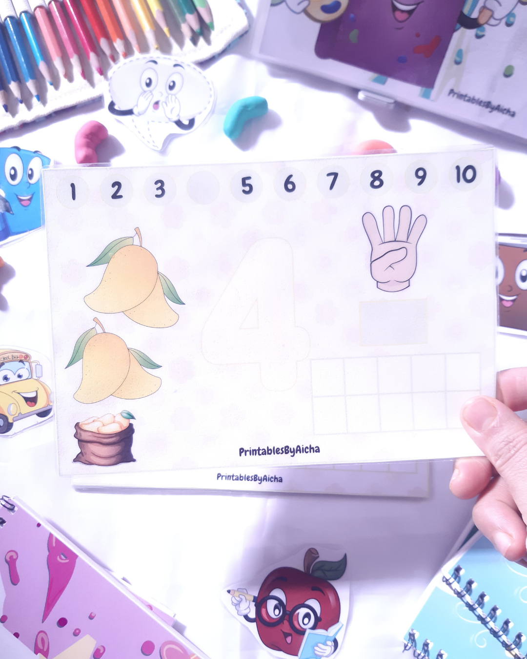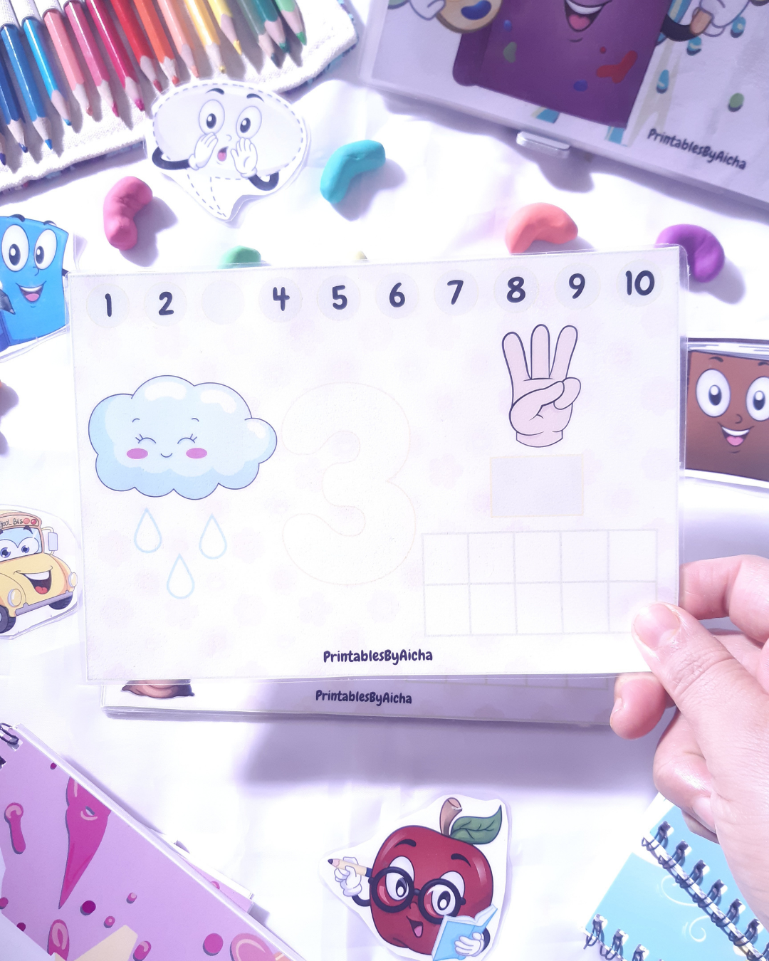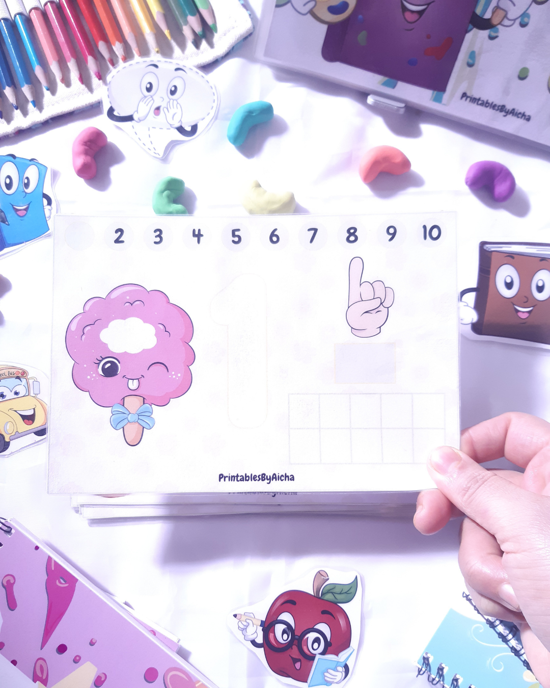 تجمع بين تعلم الأرقام، تتبع الكتابة، العد باستخدام إطار العشرة، ونشاط الصلصال الحسي – كل ذلك في تصميم جذّاب مليء بالألوان والشخصيات الكرتونية المحبوبة!