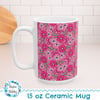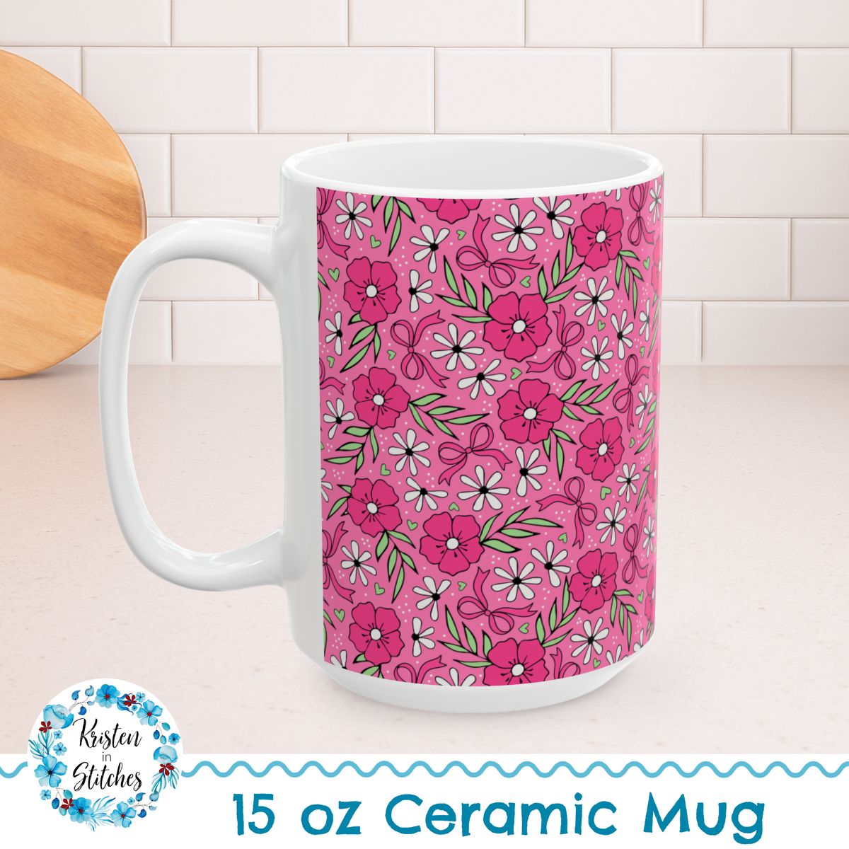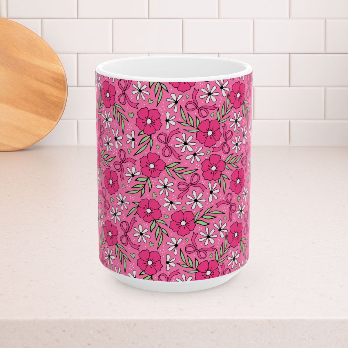 Wildflower Garden Floral 15oz Ceramic Mug, Large Coffee Cup, Pink Coquette Bows