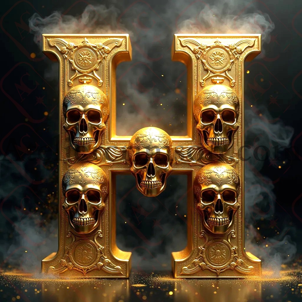 The letter H gold maya skull Skull-inspired engravings, hyper-realistic rendering. Mystical atmosphere with subtle smoke effects. Perfect for high-end typography and design projects. GoldTypography LuxuryDesign SkullArt"