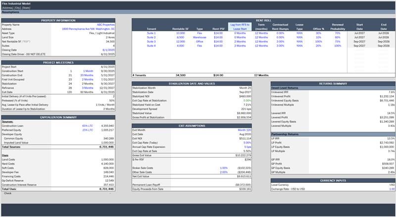 This flex industrial development model runs on only two input tabs -- dashboard and budget.