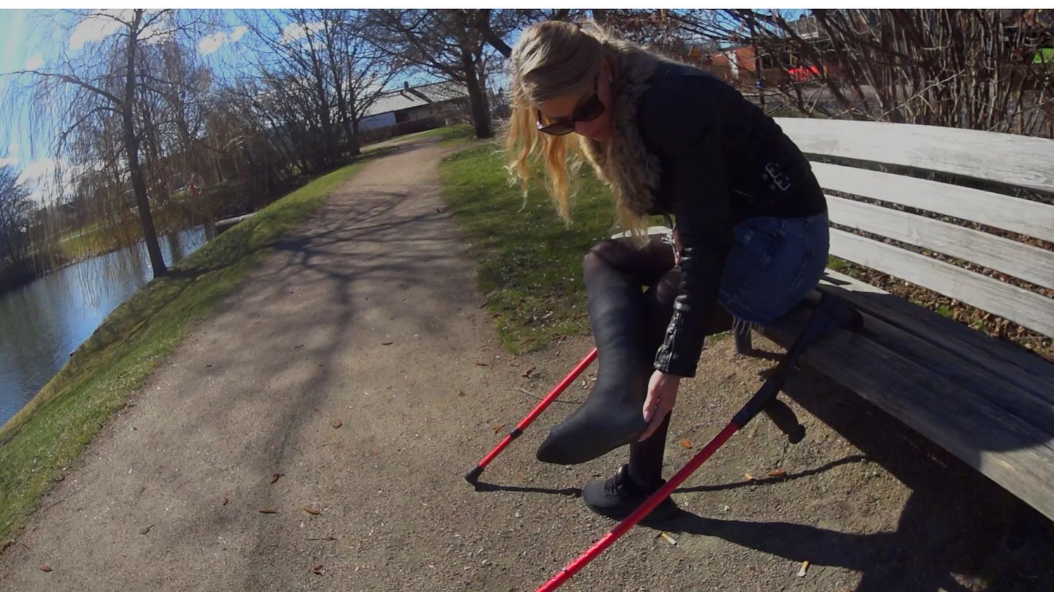 The sun is shining! which makes it a great day to go for a nice quick crutch, Ice thought. She’s heading out in black hot nylons underneath of her cute skirt, while her right foot is broken and casted in a white SLC still, she’s wearing black comfortable sneakers on her good foot today as she crutches at the park. Some quick closer looks are definitely not to forget today.