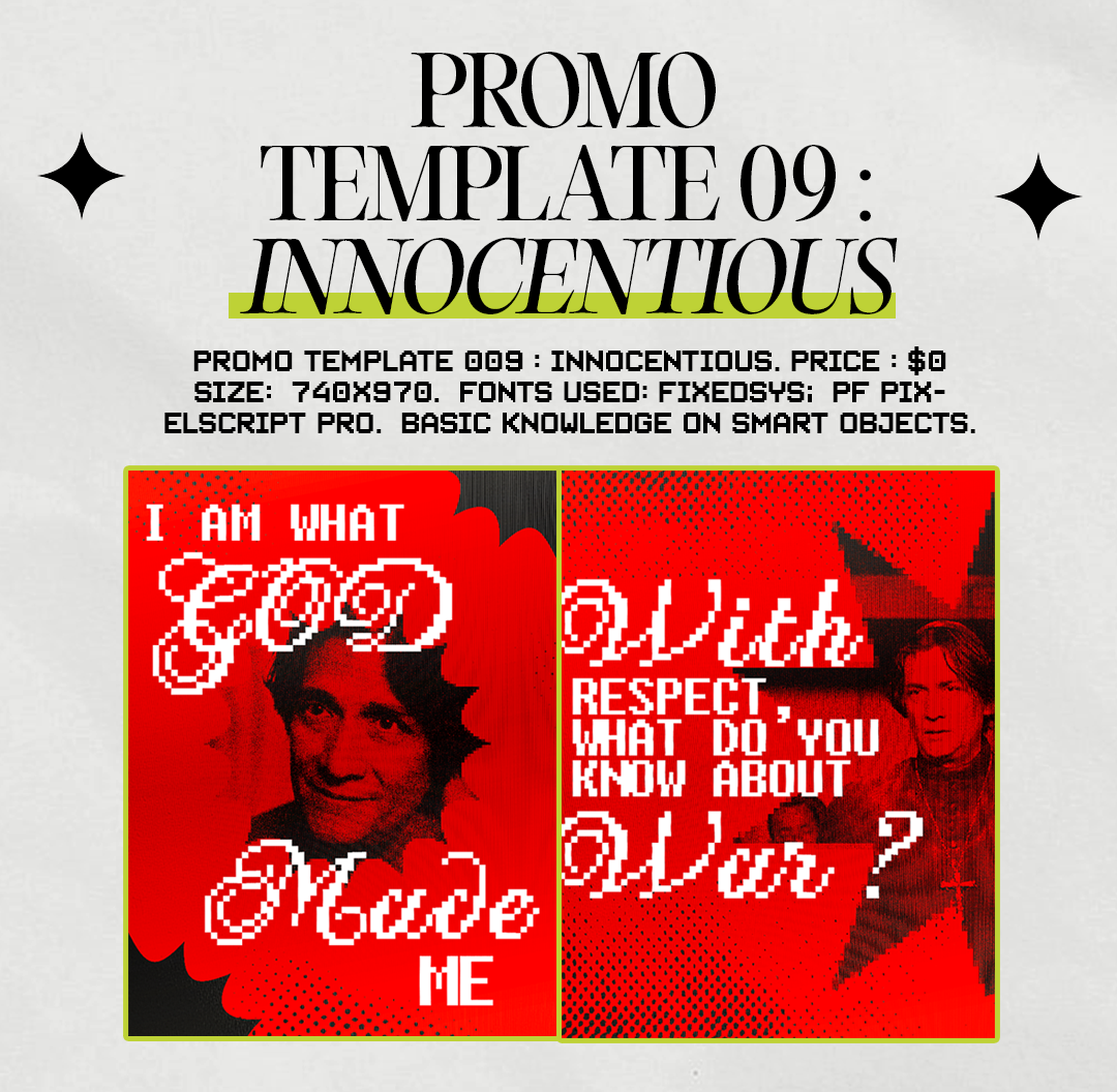 INNOCENTIOUS, dual promo (free) bitmap inspired. size: 740x970. FONTS USED: Fixedsys; PF Pixelscript Pro. basic knowledge on smart objects. colour psd isn't included. do not claim / redistribute it on your own. previously known as kaiserscomms but kaisources is opening commissions as well!