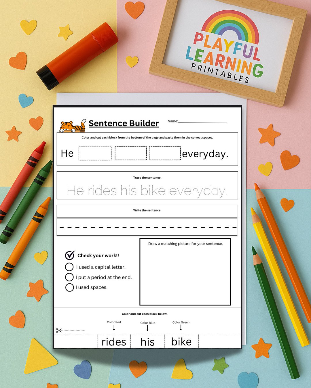 This hands-on printable pack was made for early learners who are just starting to build complete sentences. It’s the perfect mix of learning and creativity, designed to support your child’s reading, writing, and fine motor skills all in one.