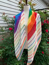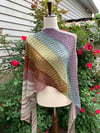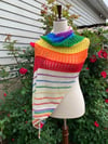 This wrap was inspired an idea. What if we could stand under a rainbow and see all of the colors of the earth around us filtered through its beauty? I imagined that all of the colors would be muted and earthy, like the gorgeous colors in the Introvert Rainbow set from Golden Sheep Fibers, but if we then paused to look up at the sky we would see the brilliant rainbow reflected in Knit Circuses traditional pride rainbow set blazing across the sky. It was a lovely thought that I tried to capture here. I hope that you love it as much as I do!