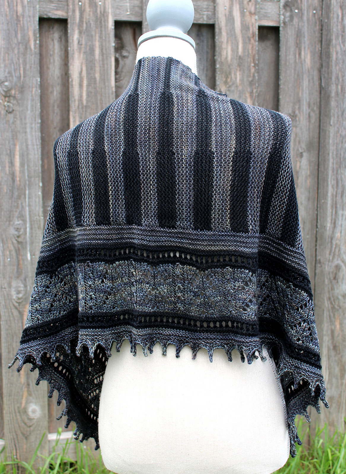 Short rows, lace, and simple colorwork combine in this homage to big cities everywhere, with their sleek modern sky scrapers juxtaposed next to their older, more opulent architecture. Buildings dance across the top of this shawl while the foundations of the city are firmly rooted in the older lace patterns across the bottom edging. Maybe it’s New York City, maybe Chicago, Boston, Paris, or London. Maybe Godzilla’s Tokyo, Batman’s Gotham City, or Superman’s Metropolis. Whatever your color choices or the city they evoke for you this textured shawl will keep out the chill from San Francisco’s foggy bay to the whipping winds at the top of Paris’ Eiffel Tower