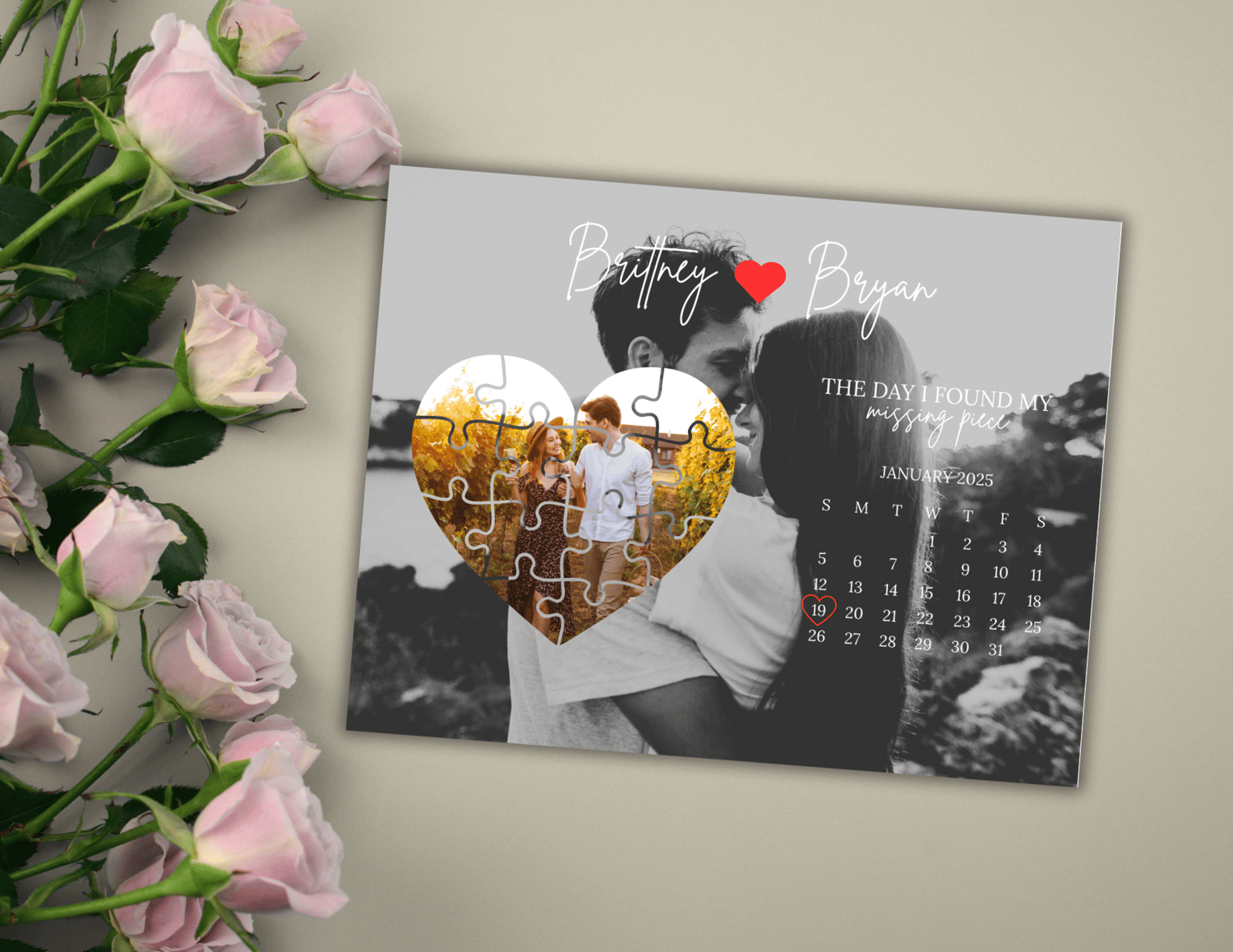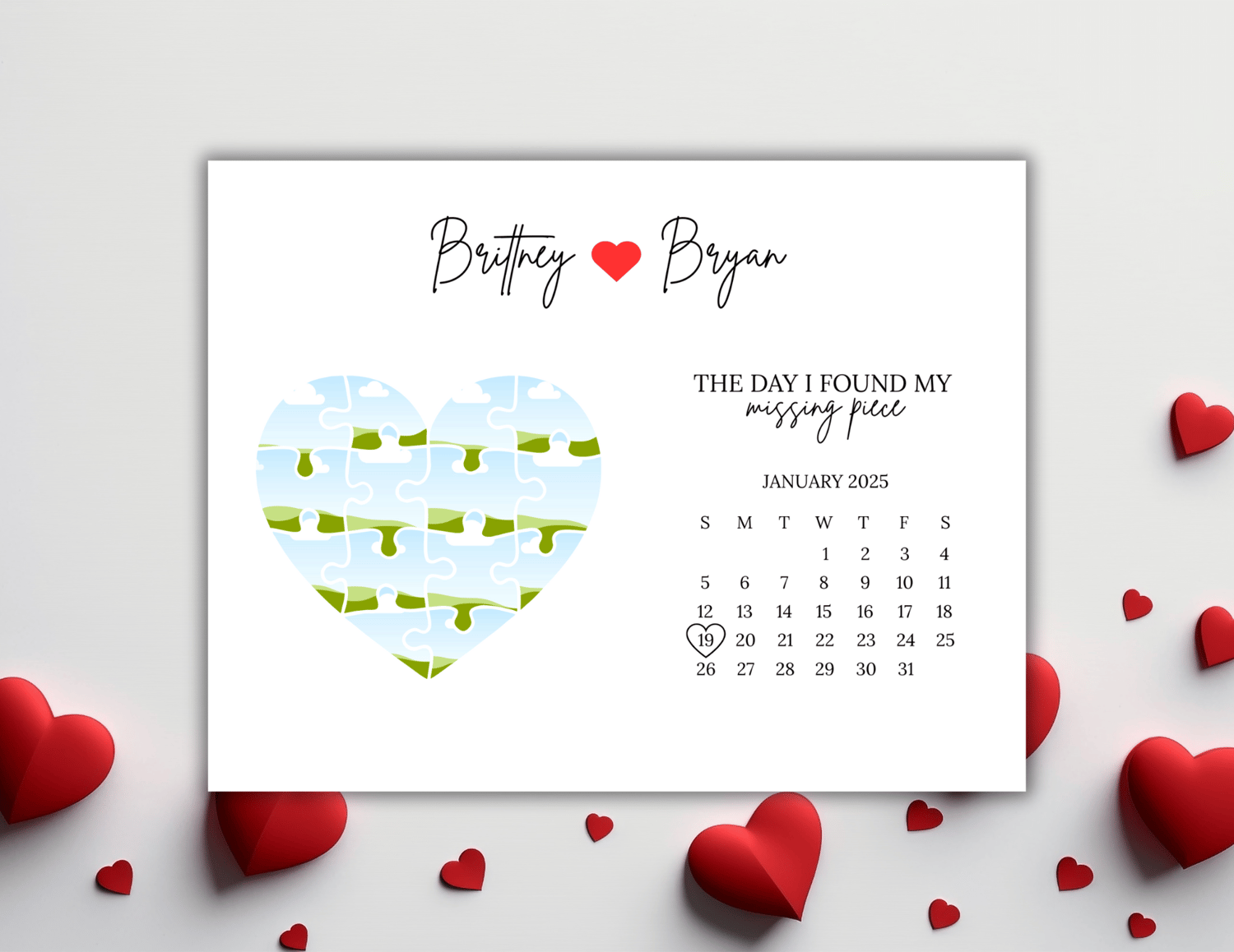 Personalized Heart Puzzle Calendar Print – “The Day I Found My Missing Piece”