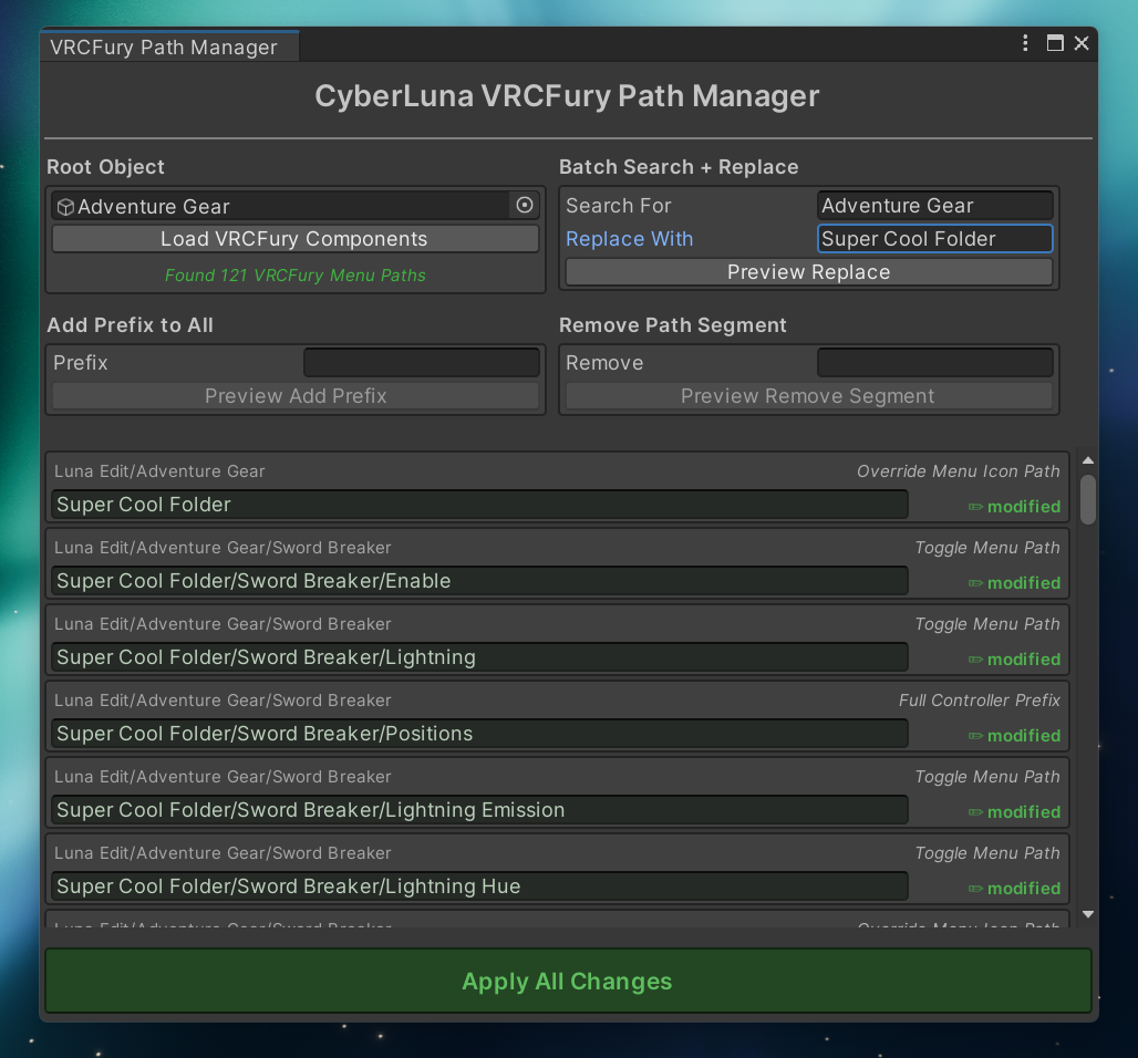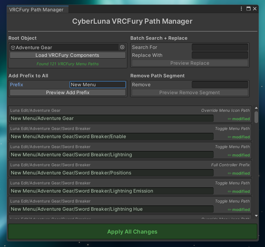 Take control of your VRCFury projects with the Menu Path Manager, a sleek and intuitive Unity Editor tool that lets you instantly batch-edit all VRCFury Toggle, Icon, and Controller paths.