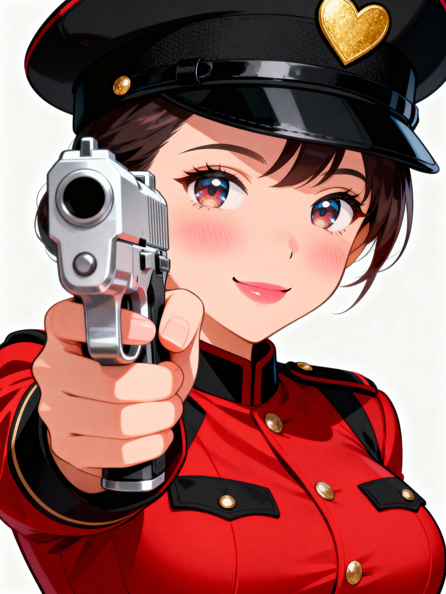Capture pure adrenaline with this fierce high-resolution digital portrait: a stunning anime enforcer girl in a sharp red-black military uniform, glossy peaked cap topped with a luxurious golden heart emblem, gripping a sleek pistol with confidence. Mesmerizing eyes, flushed cheeks, and bold smile – commanding, seductive, and full of attitude!