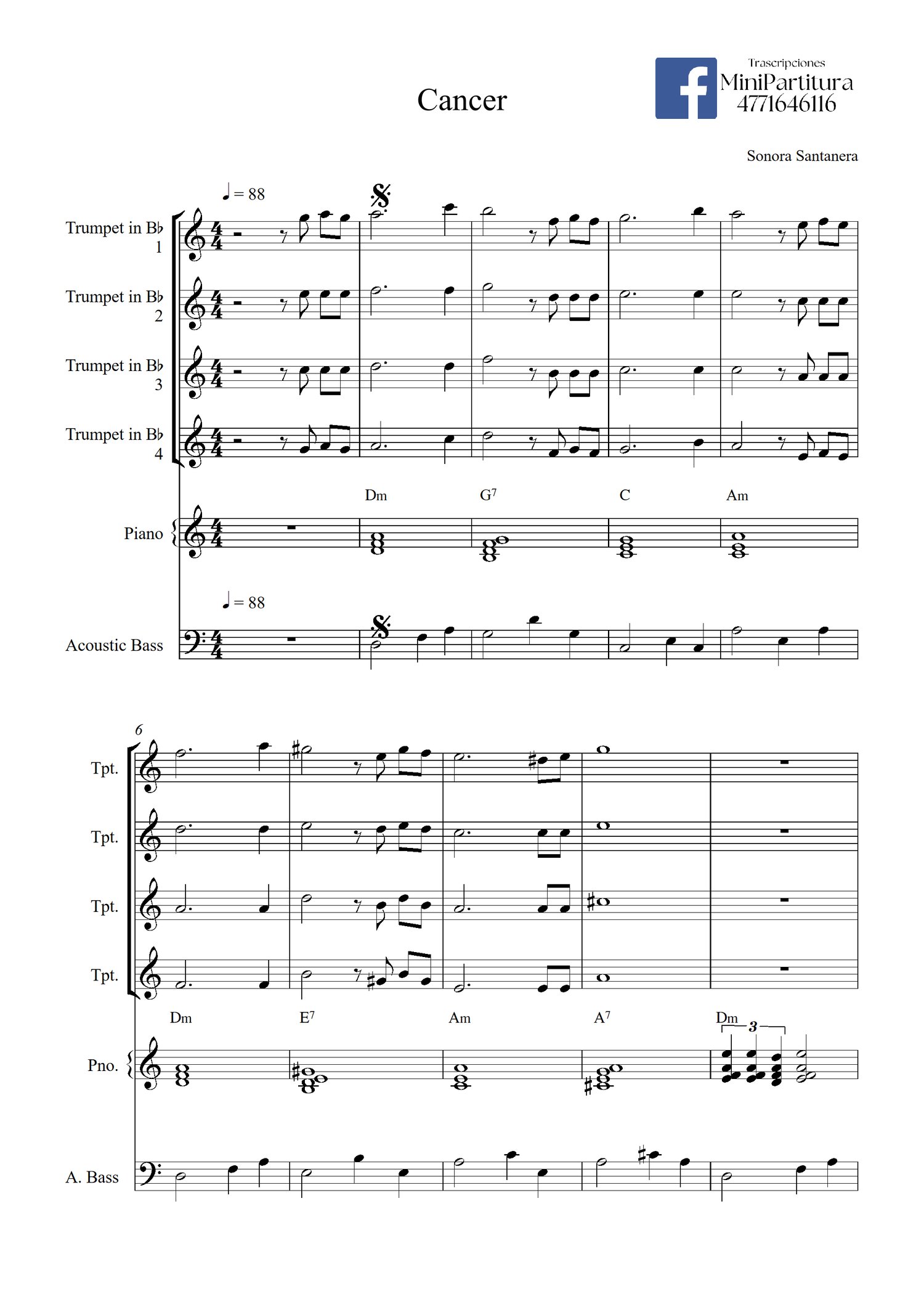 Partitura de la canción (Cáncer - Sonora Santanera) Para Trompeta 1, 2, 3, y 4, Piano y Bajo (Acústico)