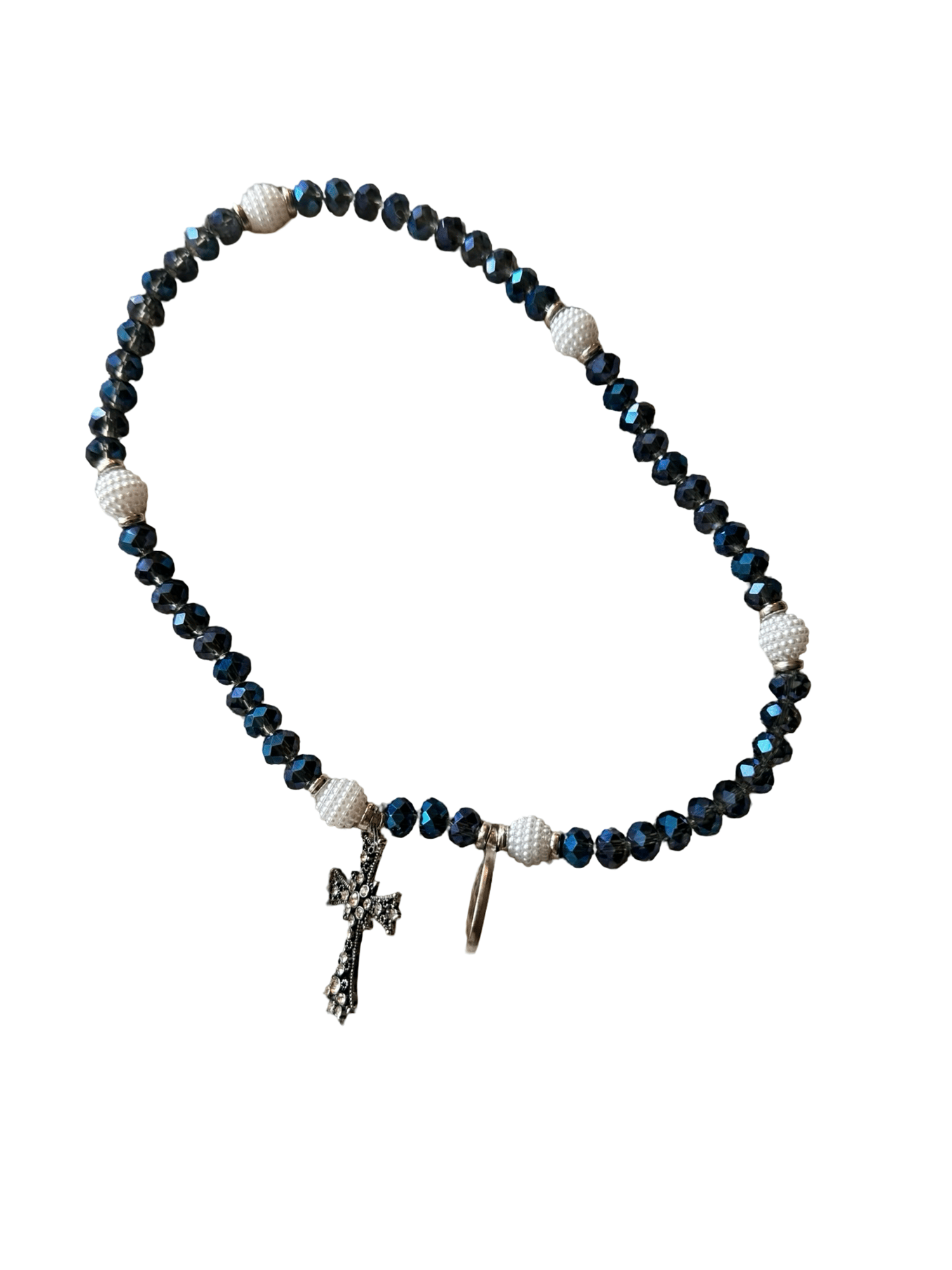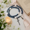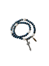 This stunning full rosary wrap bracelet brings the complete rosary experience to your wrist. Featuring deep blue faceted crystal beads paired with elegant white pearl-textured accents, this innovative design wraps twice around your wrist, allowing you to pray all five decades while wearing a beautiful piece of devotional jewelry throughout your day.