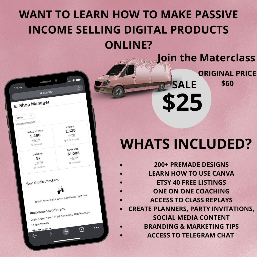 Purchase this Canva Masterclass! Not only will it help with promotion for your business but it also help to bring more income! You can make over a $100 dollars a day, and sell on over 5 platforms making $500 a day!