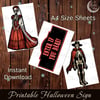 This is a Spooky Halloween Sign with skeletons in red and black color! You will get 3 individual signs and you can assemble them as per your preference. I recommend printing on cardstock( thick paper). You can trim the skeletons and glue them onto the black board or use them individually. Be creative and have fun! For customization, you can add beautiful lace ribbons or other details. Save time by instantly downloading and printing the items, there is no shipping cost.