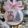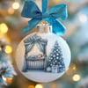 Mock-up of two white glitter baubles, one with a pink bow and the other with a blue bow, perfect for showcasing your Christmas designs to customers.