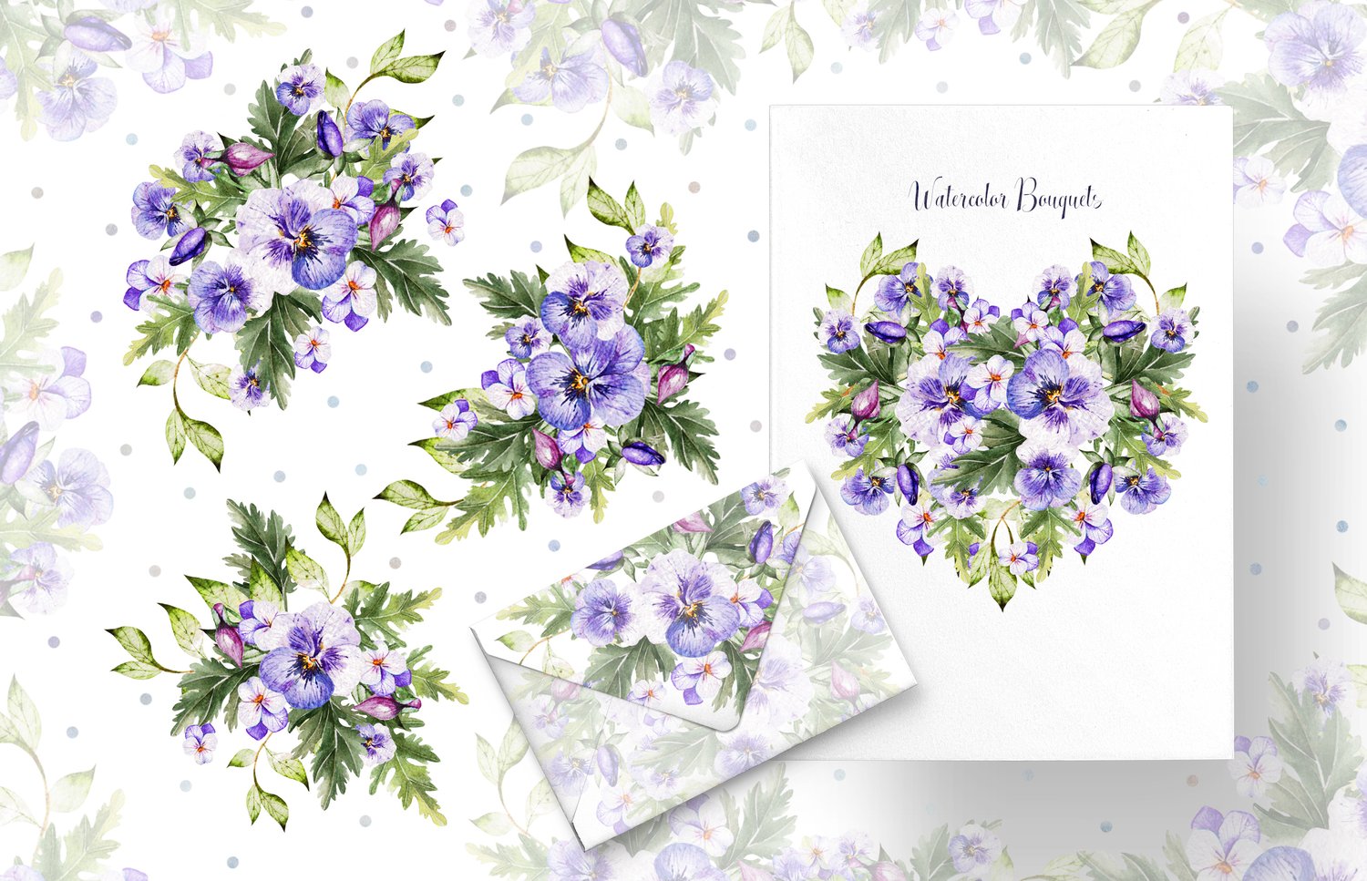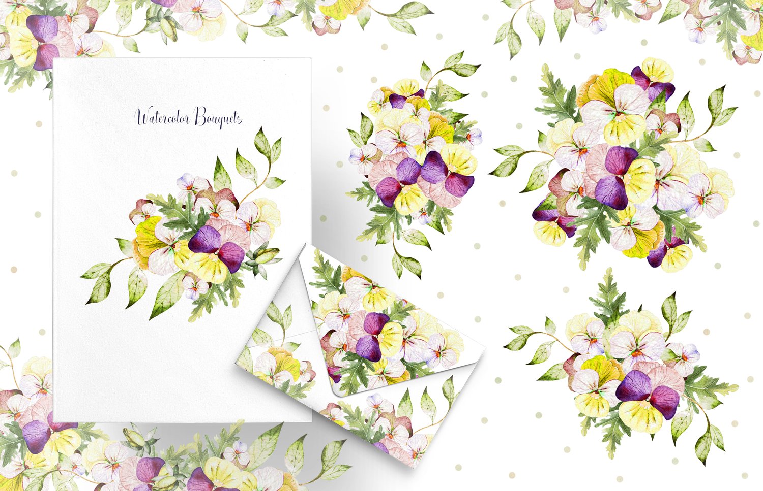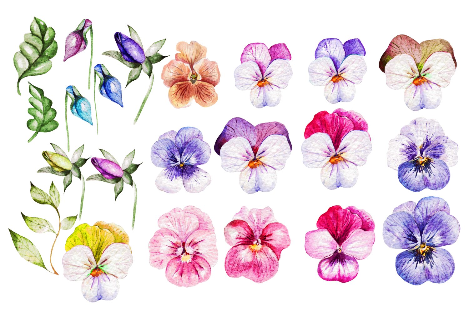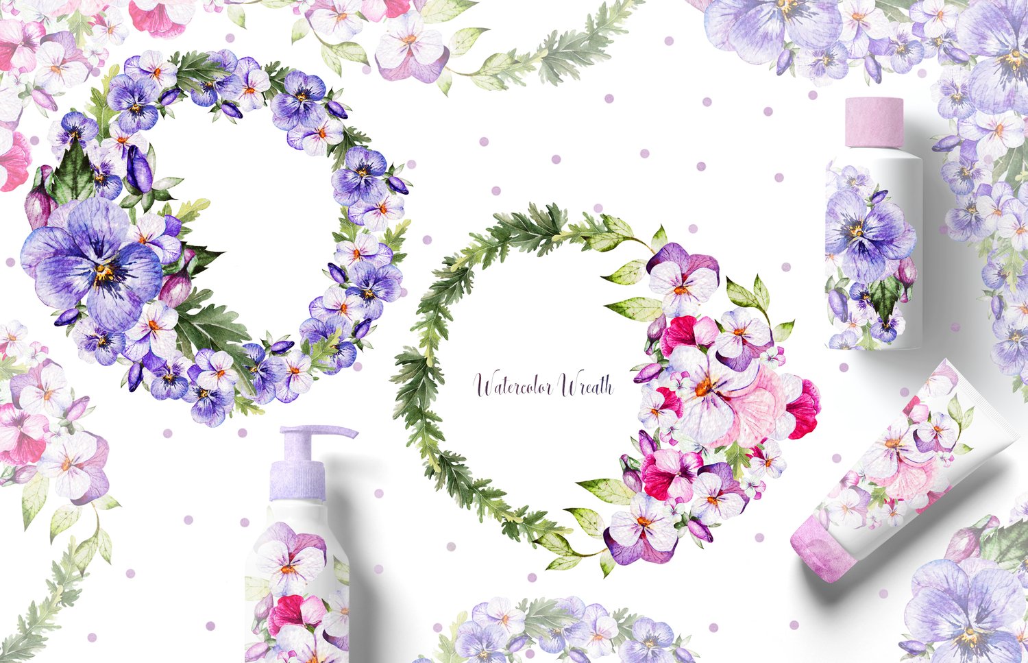 This watercolor set consists of 78 watercolor elements. They include patterns, bouquets, wreaths, elements separately and cards. Delicate watercolor pansy, leaves and buds.