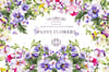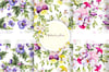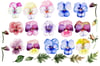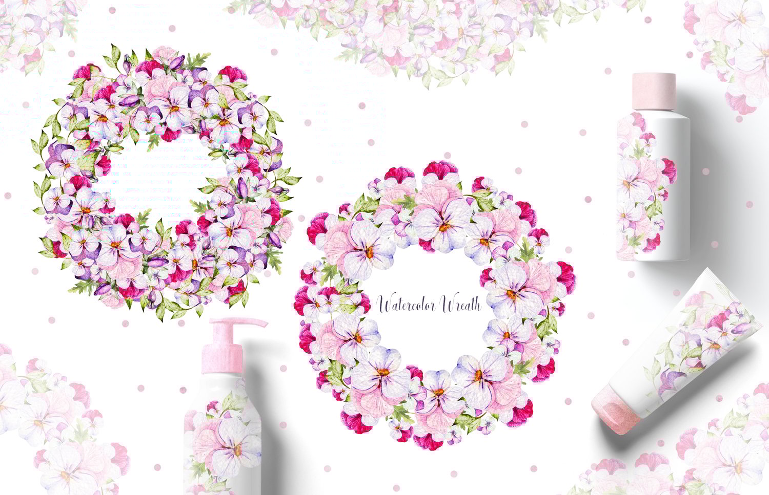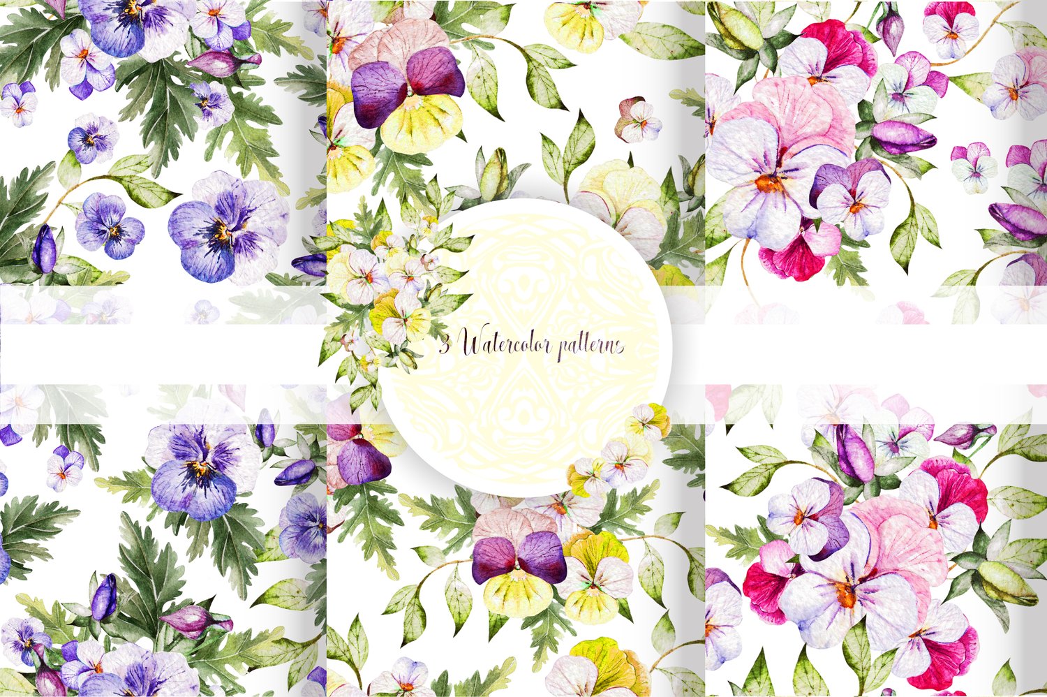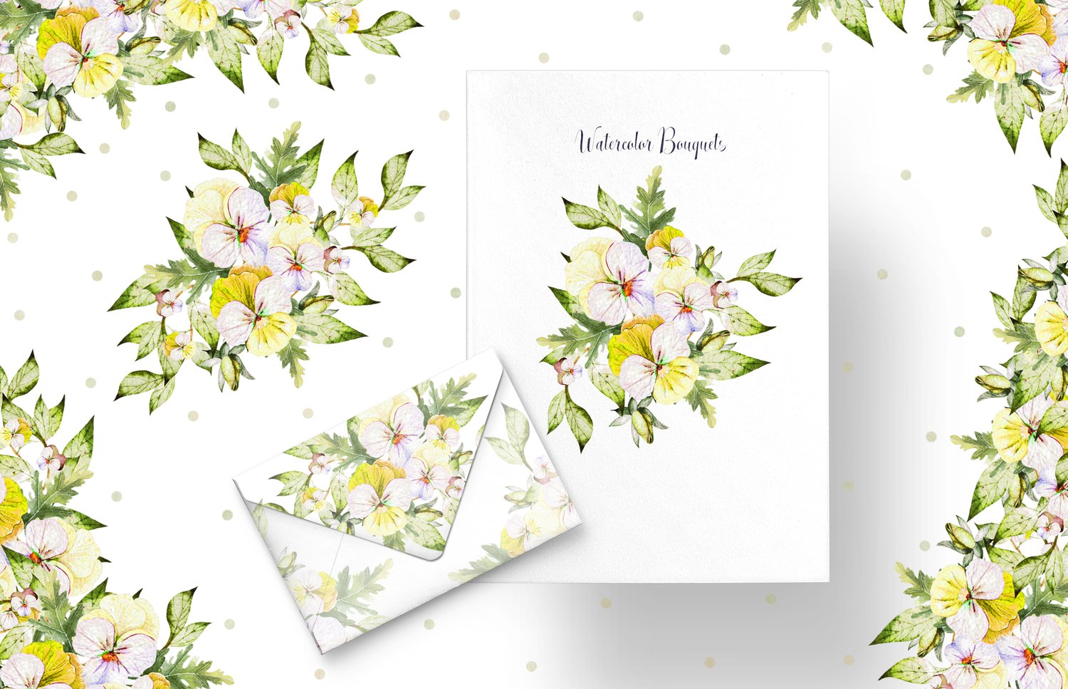 This watercolor set consists of 78 watercolor elements. They include patterns, bouquets, wreaths, elements separately and cards. Delicate watercolor pansy, leaves and buds.