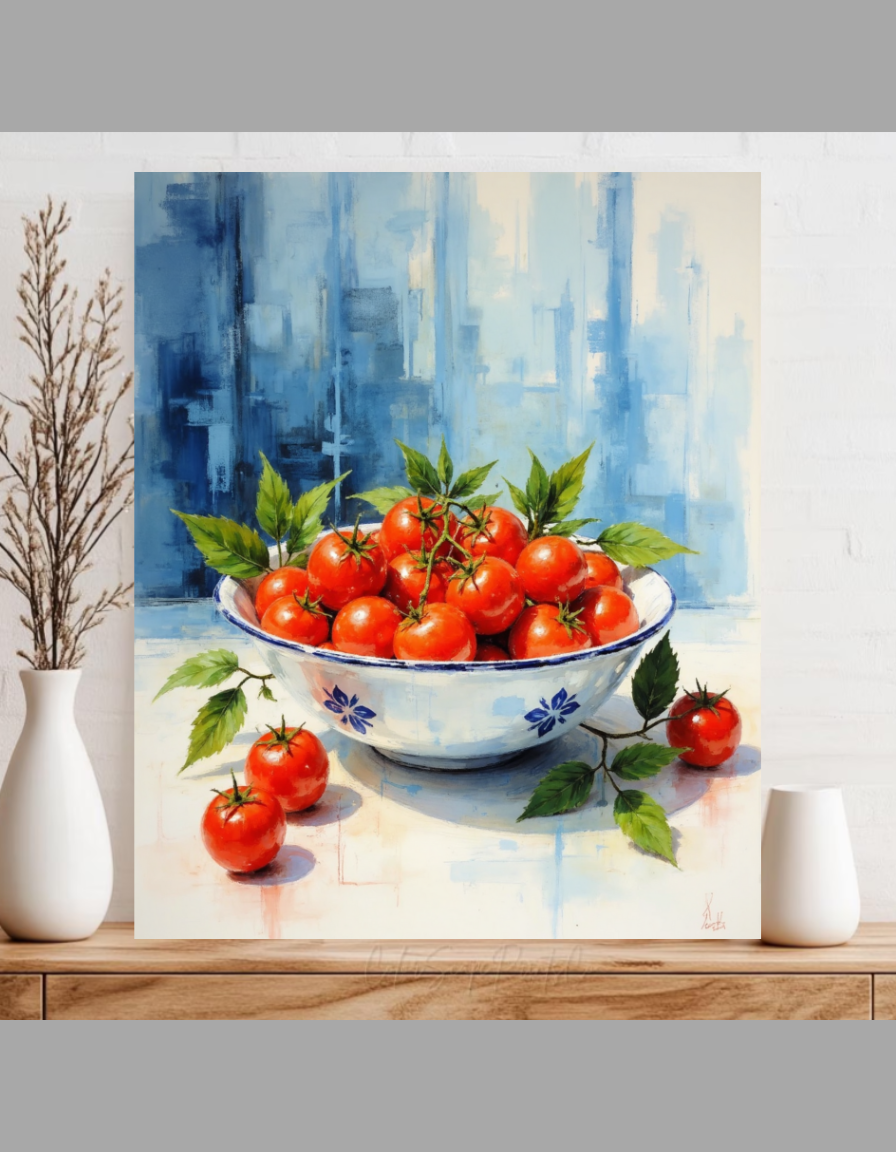 Fresh Harvest Tomatoes in Blue Bowl - Vibrant Still Life Kitchen Art Print
