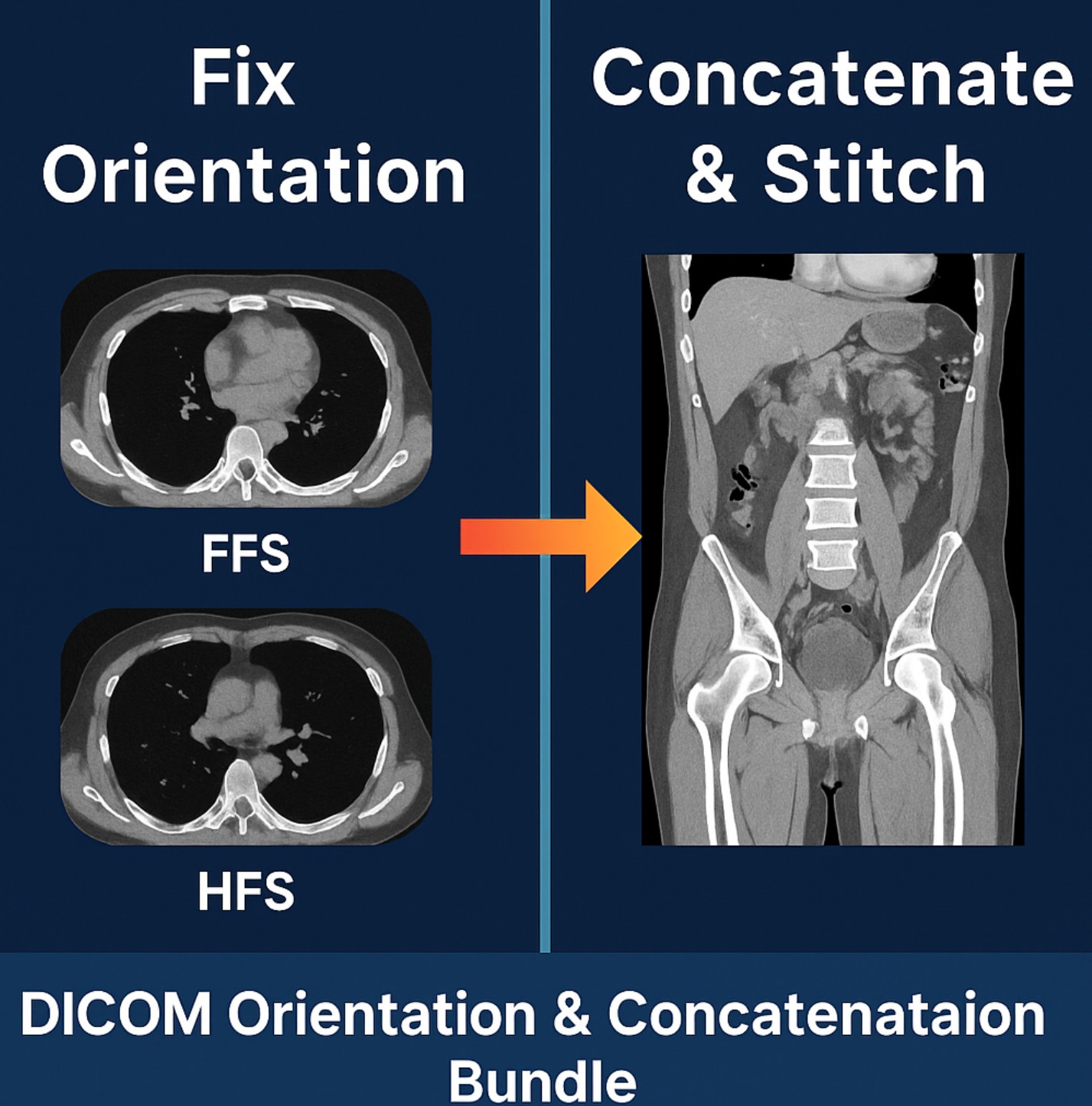 This bundle gives you both Part 1 (FFS β HFS Orientation Fix) and Part 2 (CT Concatenation & Registration), providing a complete solution for standardizing and stitching DICOM CT datasets.