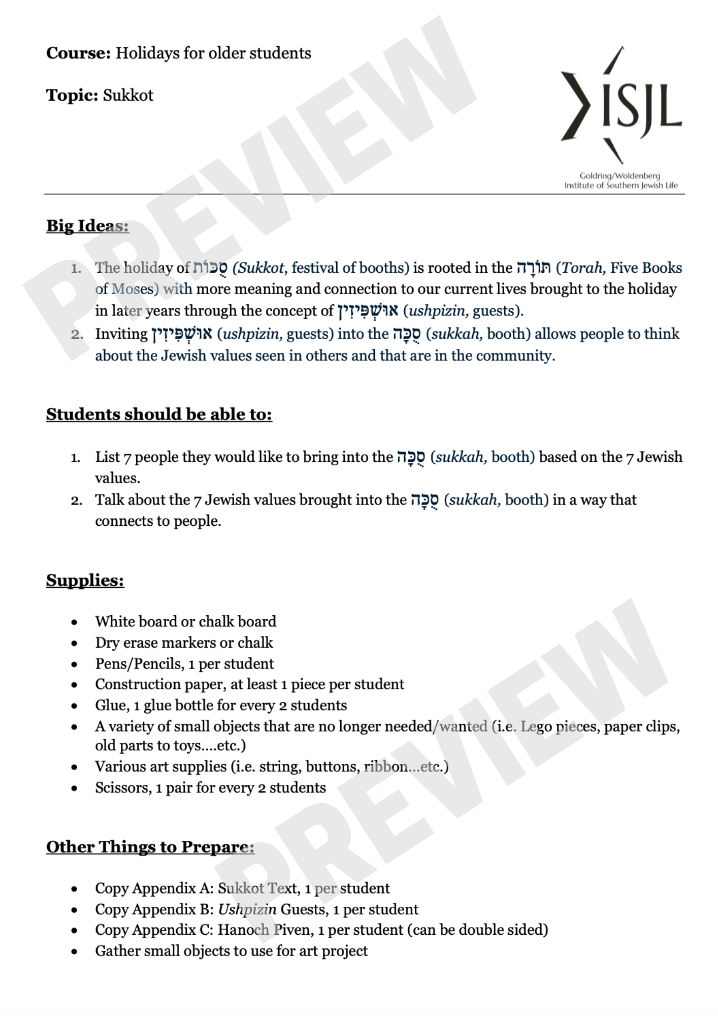 In this 70 minute lesson designed for 8-10th graders, students will explore the concept of Ushpizin (Guests). Specifically they will learn about the 7 Jewish values that accompany the Ushpizin during the different days of Sukkot. Finally, using the art techniques of Israeli artist Hanoch Piven, students will create a Sukkot guest to invite into their Sukkah.
