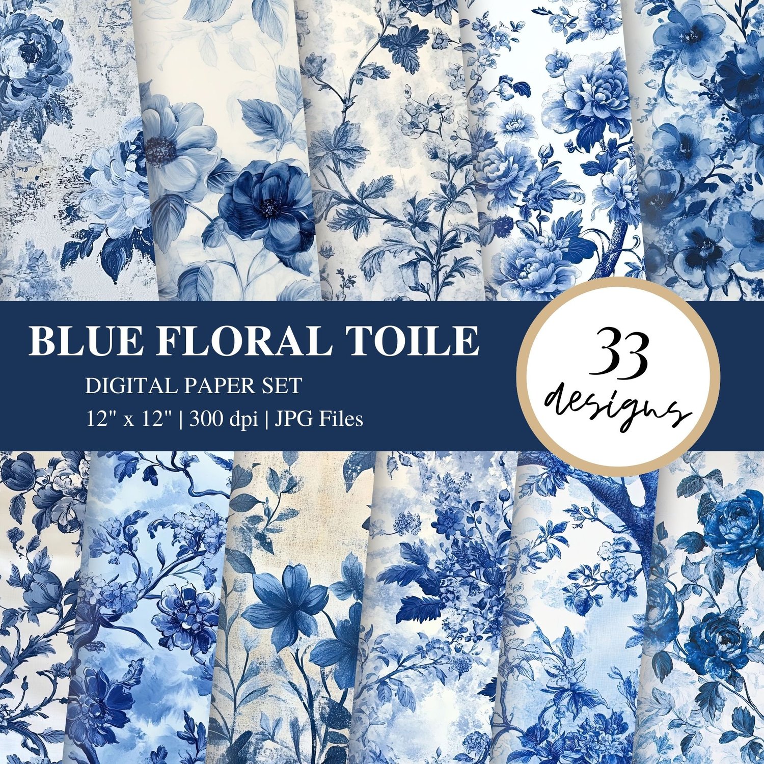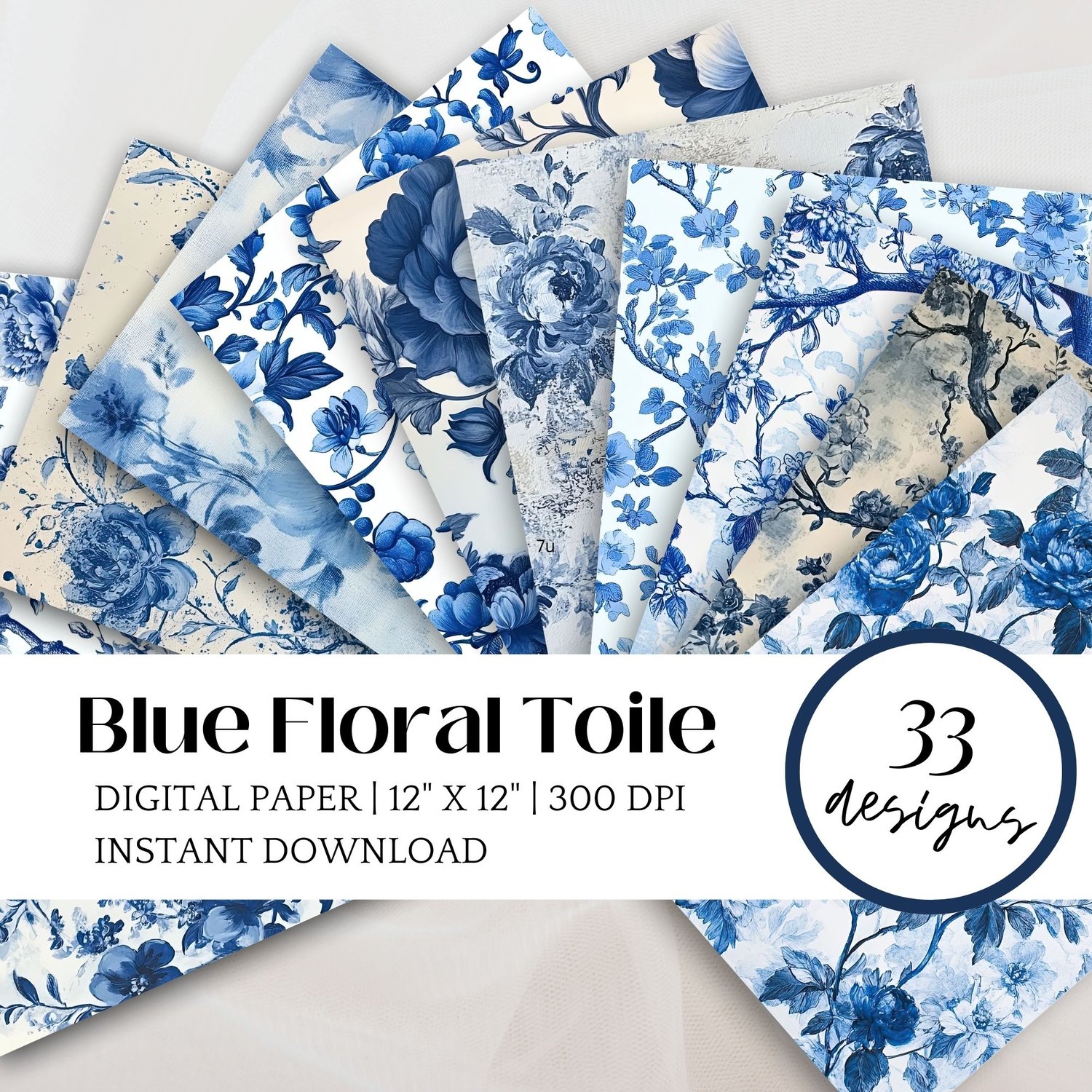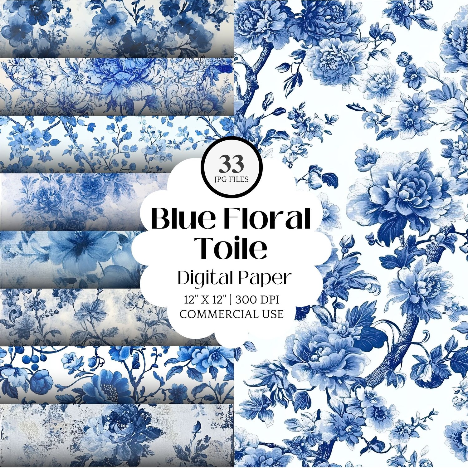 💙 33 JPG files – 12x12 inches, 300 DPI, with stunning blue floral toile patterns.