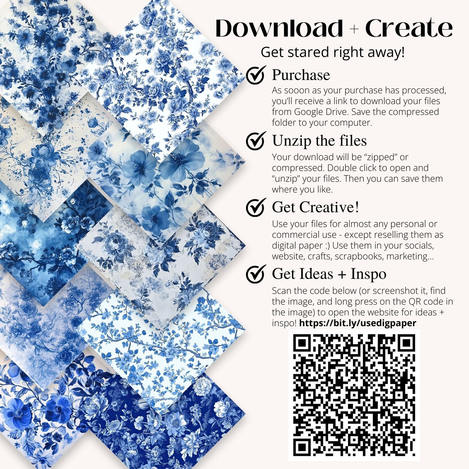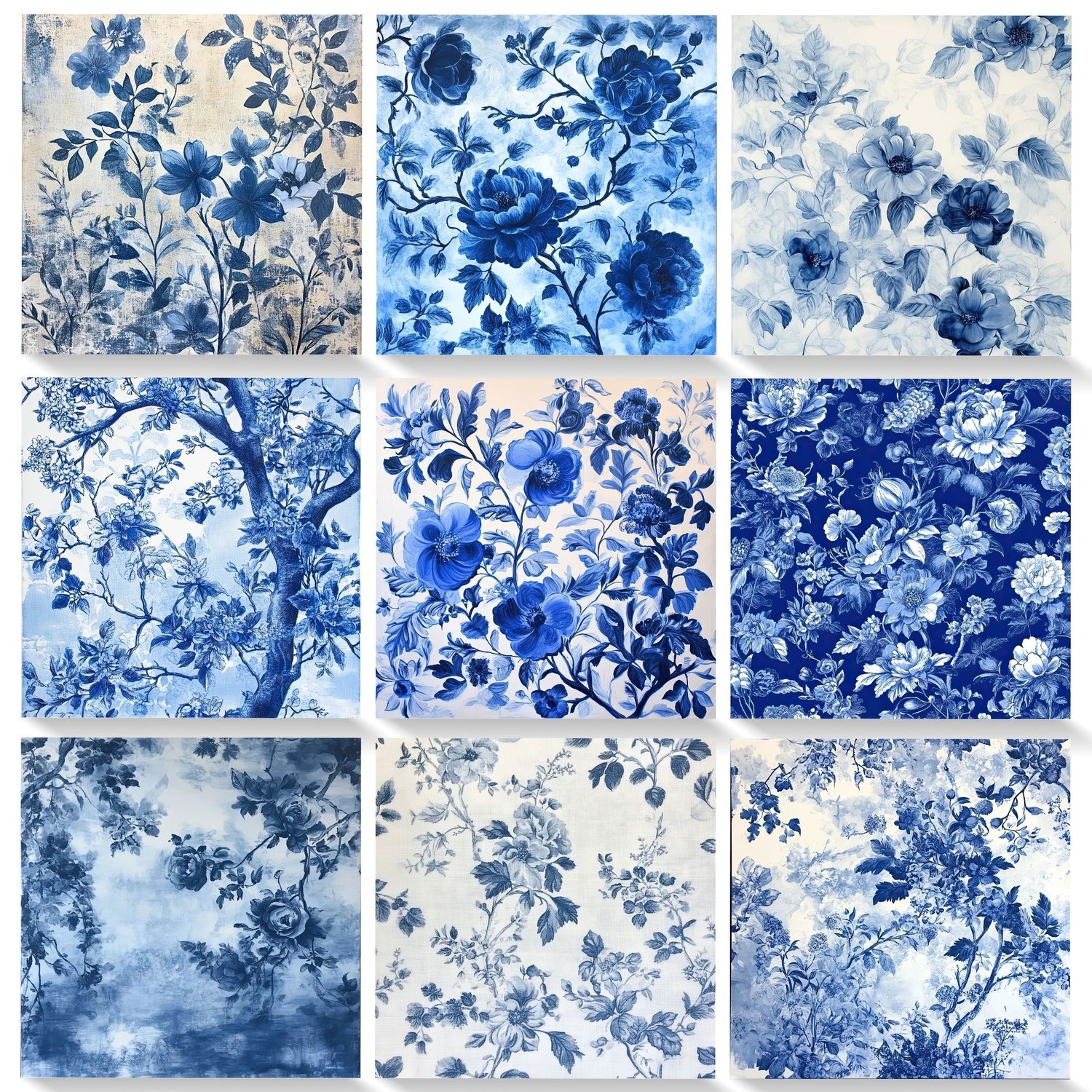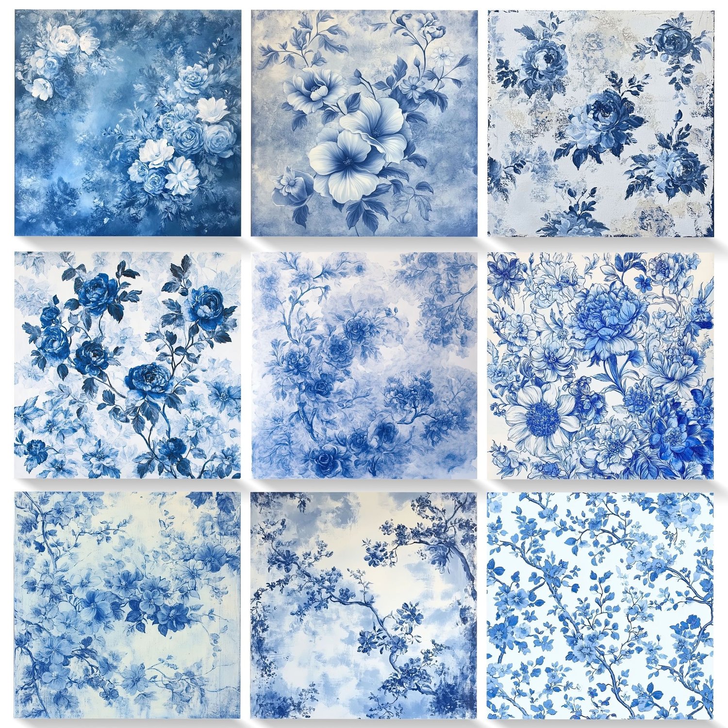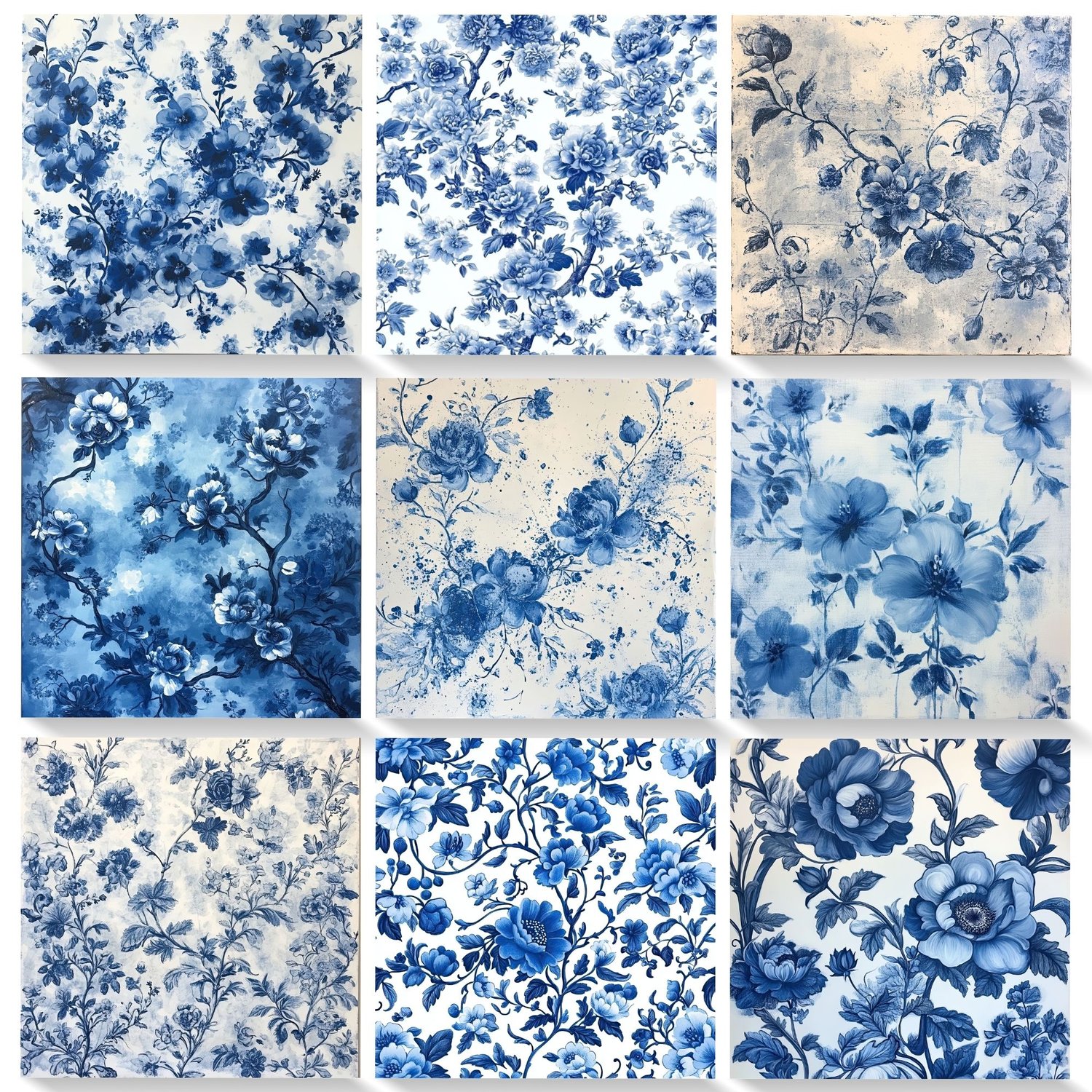 💙 33 JPG files – 12x12 inches, 300 DPI, with stunning blue floral toile patterns.