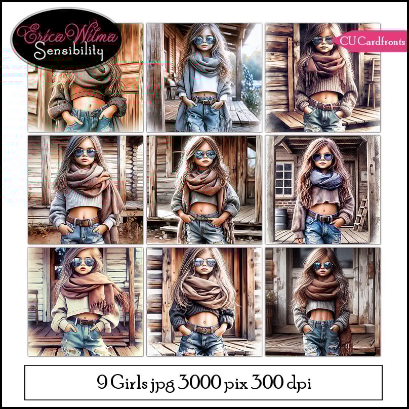 Bring a modern and trendy vibe to your creative projects with this unique set of 9 stylish girl cardfronts. Each design showcases fashionable outfits, cool sunglasses, and rustic wooden backgrounds, perfect for adding a bold and contemporary touch.