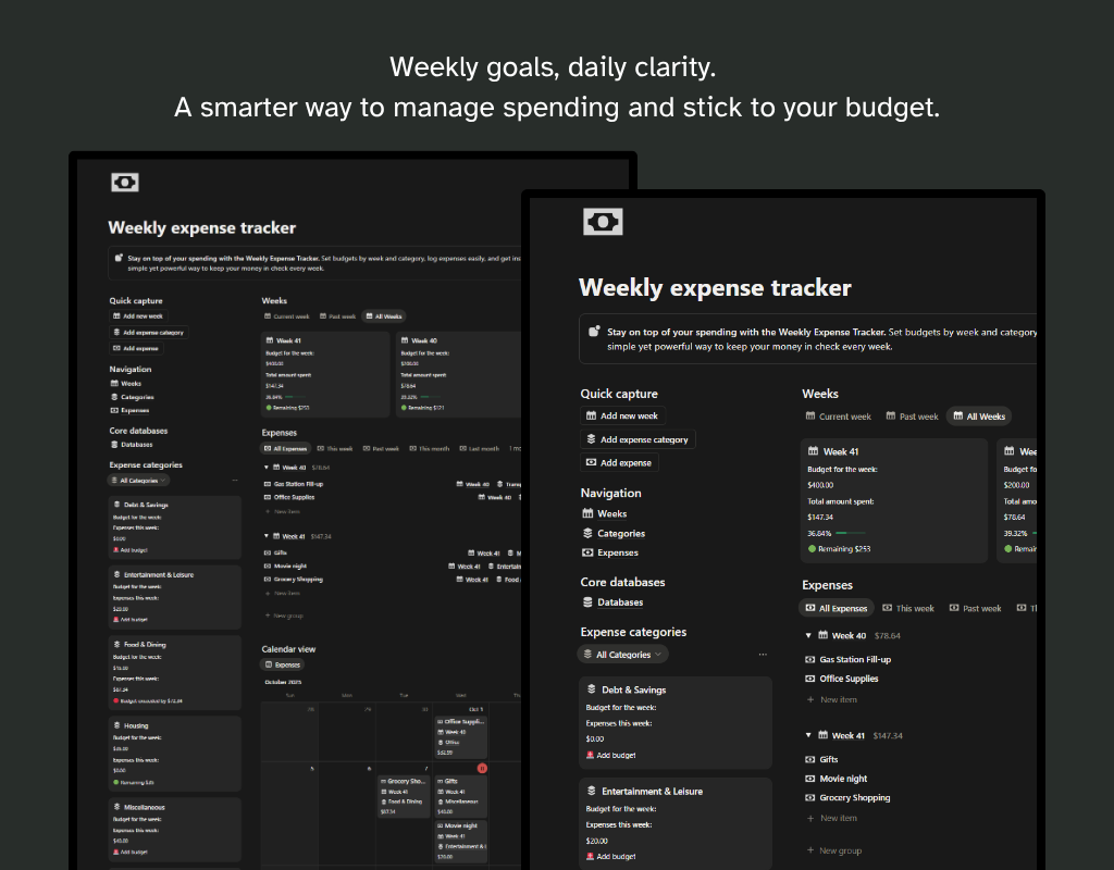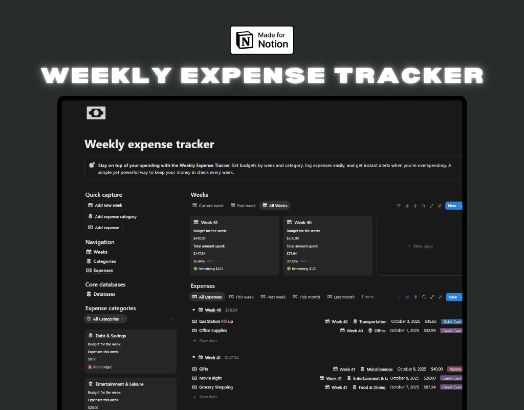 The Weekly Expense Tracker is a smart Notion template designed to help you take full control of your spending habits. With three connected databases—Weeks, Categories, and Expenses—it gives you both a big-picture overview and detailed insights into your finances.