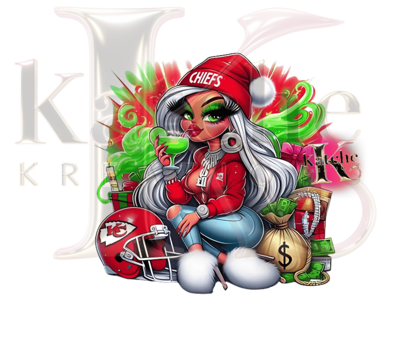 Add some elegance to the season with this “Chiefs Girl”—a stunning twist on holiday style with her shimmering fur-lined coat, glamorous jewelry, and a look that says she's here to sleigh! Holding bright ornaments with a mischievous grin, she’s perfect for anyone looking to add a bit of cool glamour to their Christmas decor.