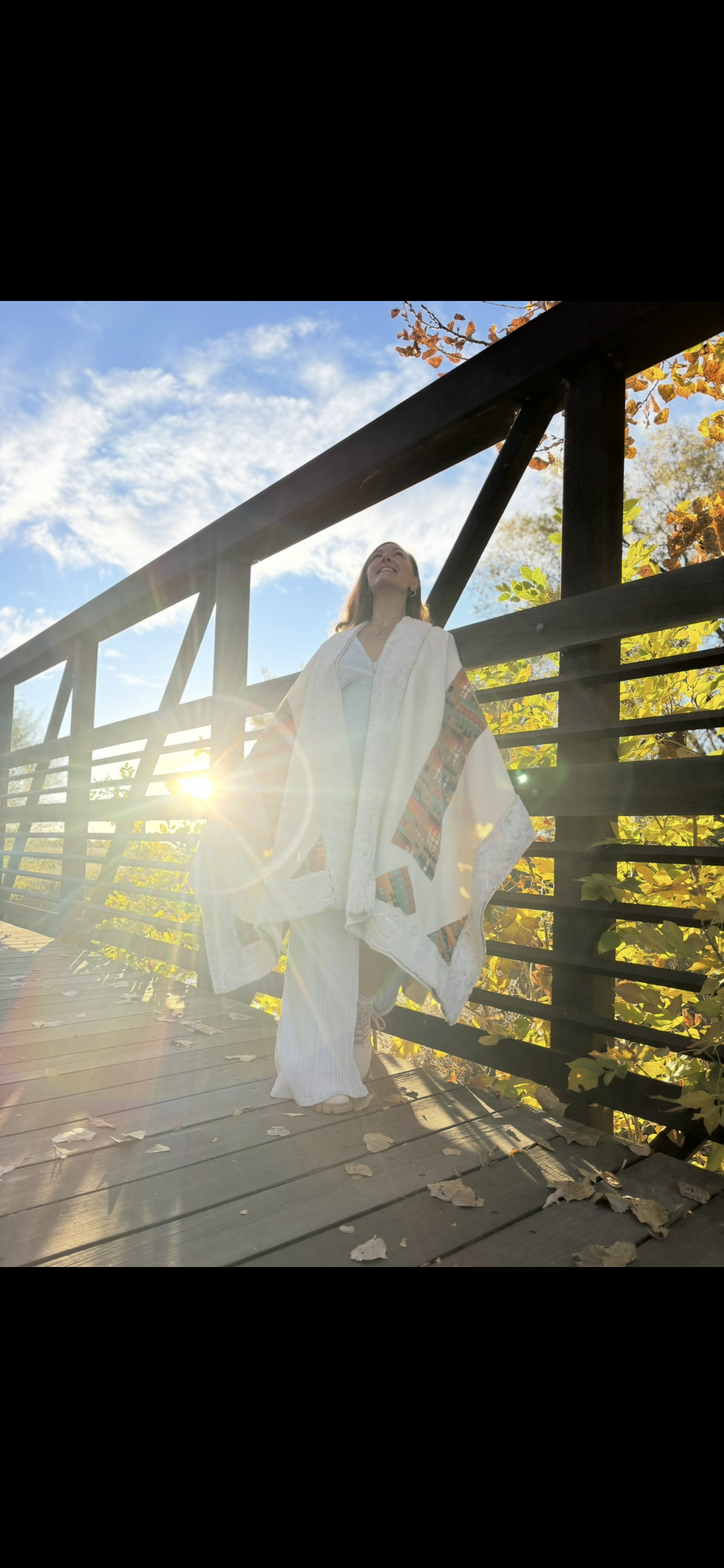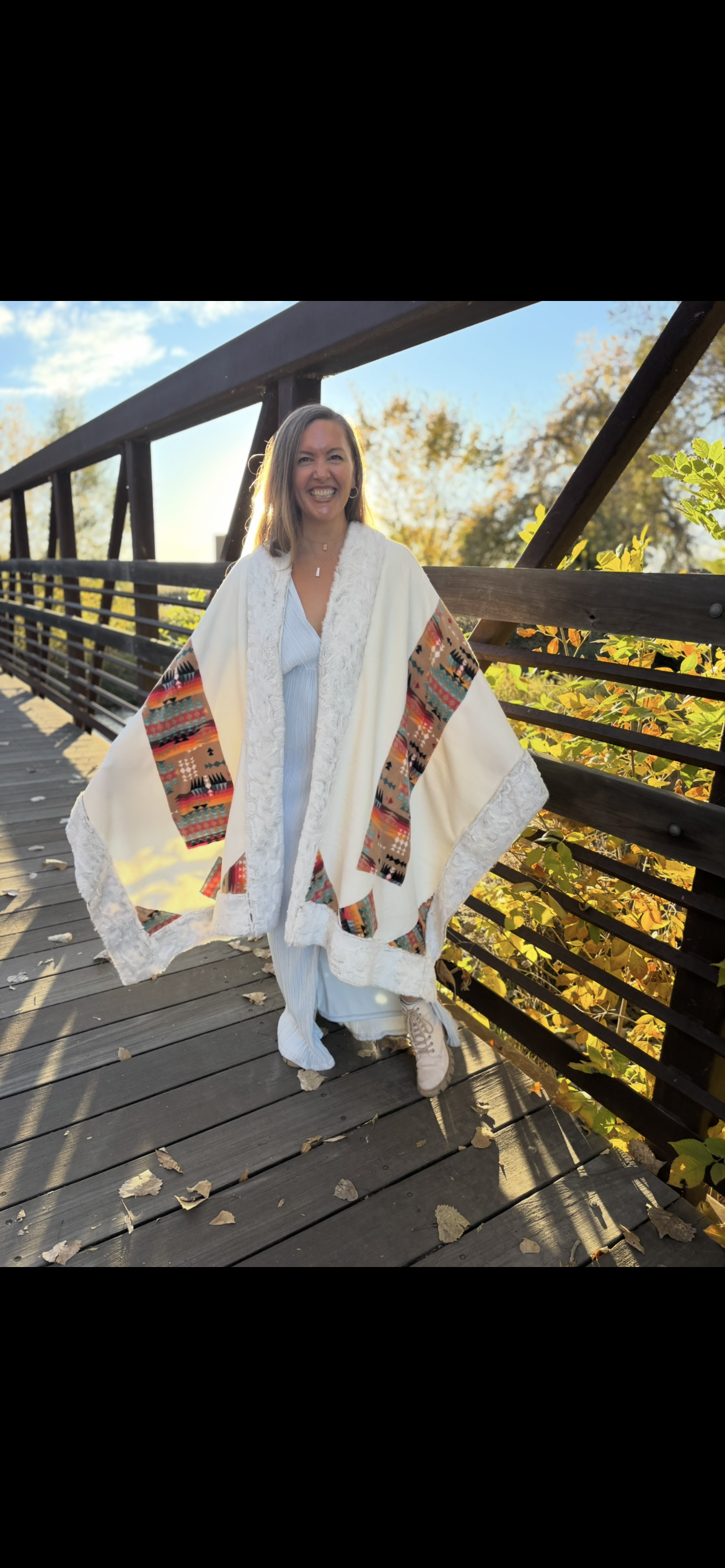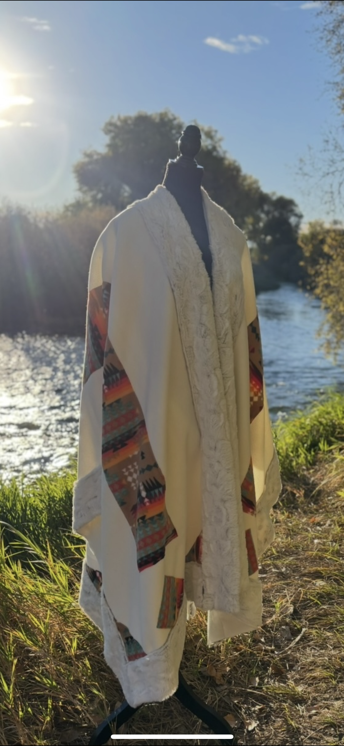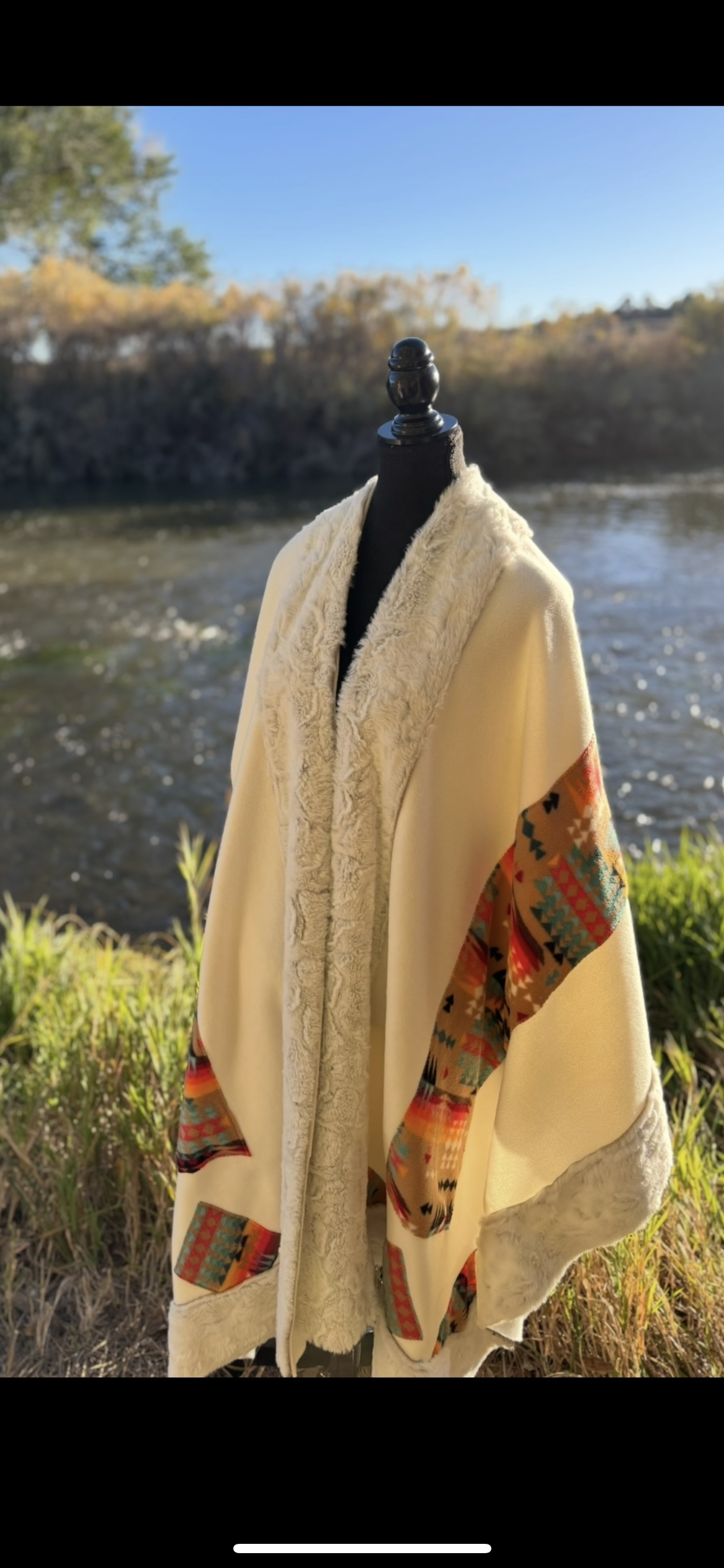 Soft, warm and beautiful open Poncho, fully lined. Made with Fleece, Minky velvet, Sustainable Satin and Faux Fur.