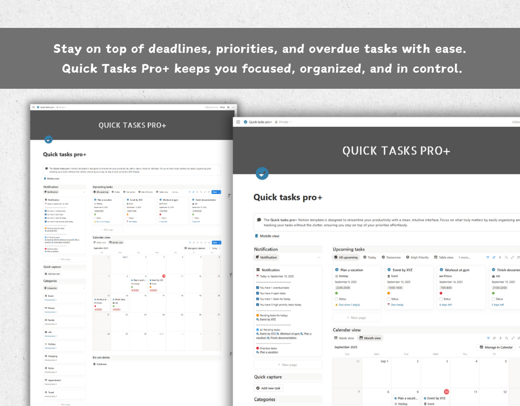 Quick Tasks Pro+ is your smarter, faster way to manage tasks in Notion. Built for simplicity and power, it helps you stay on top of deadlines, focus on priorities, and get more done without the overwhelm.