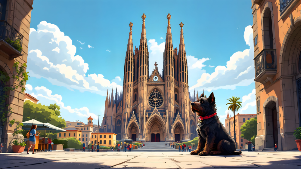 A dog sits in front of the iconic Sagrada Familia, gazing attentively at its owner. A perfect piece for dog lovers and travel enthusiasts alike!