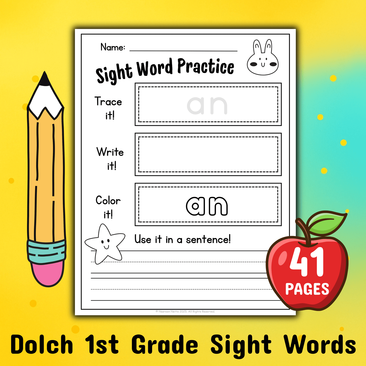 Make sight word learning fun and effective with this set of 41 Dolch Sight Word Worksheets designed specifically for First Grade students! Each worksheet helps students master sight words through tracing, writing, coloring, and sentence practice.