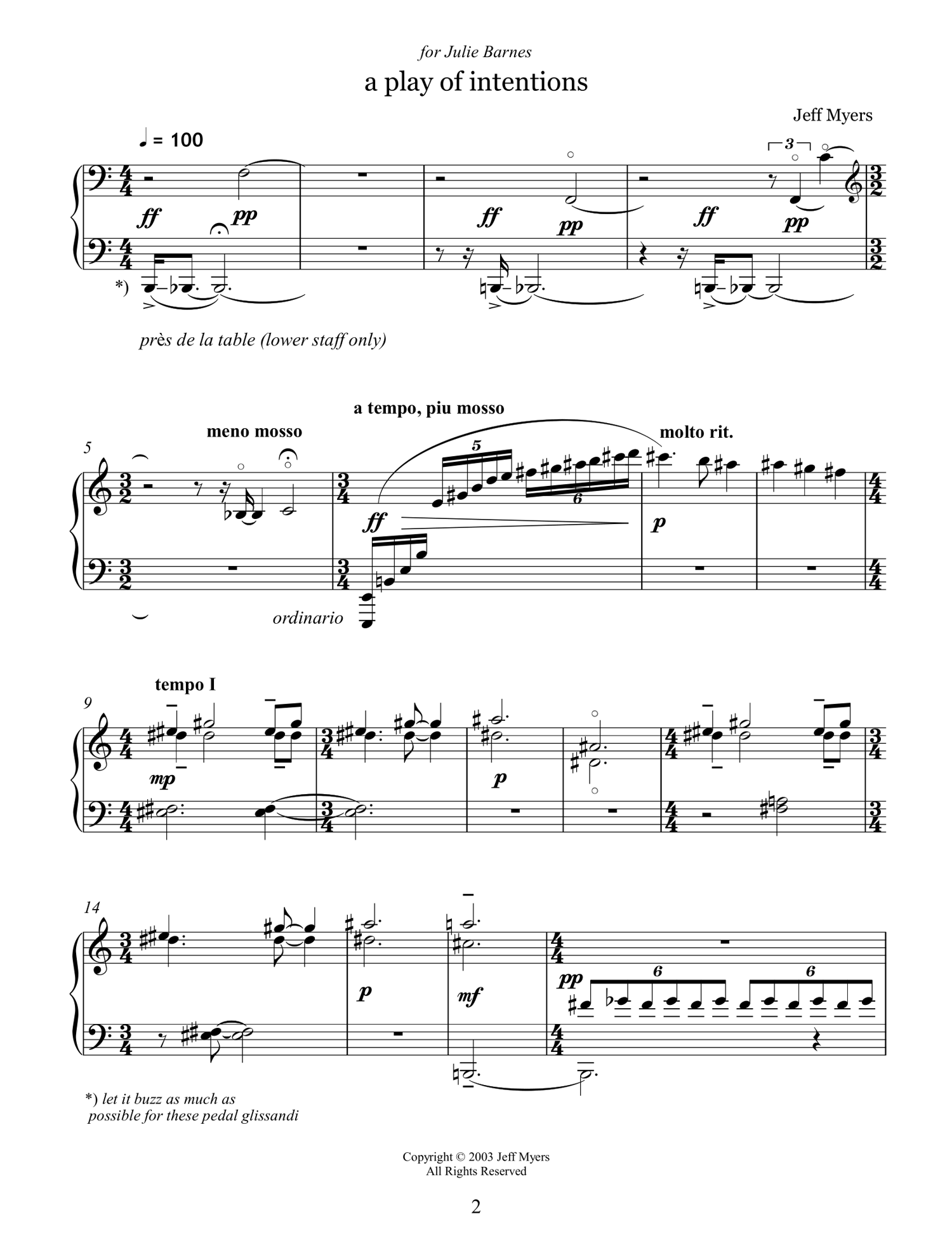 A Play of Intentions is a short fantasy for harp which plays with the idea of recurring expectations. It was written for Julie Barnes, who premiered it in October of 2003 at Rochester Contemporary in Rochester, NY.