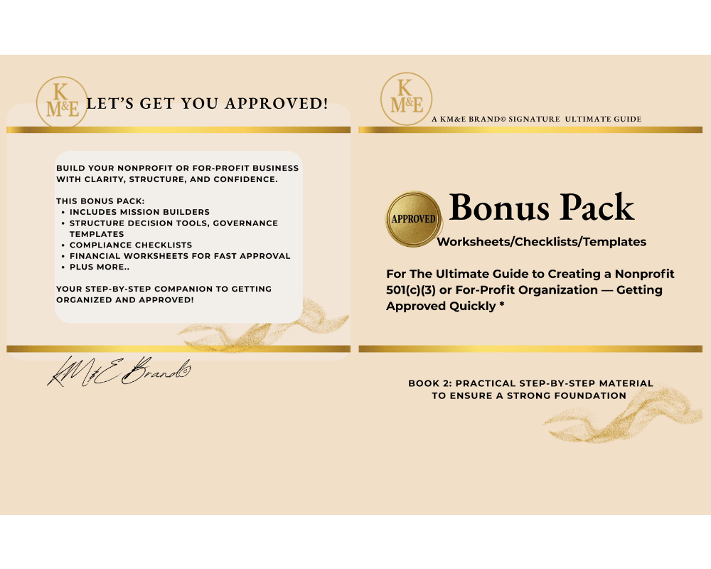 Tier 1 — Ebook Only $24.99 You will receive: The Ultimate Guide to Creating a Nonprofit 501(c)(3) or For-Profit Organization — Getting Approved Quickly *