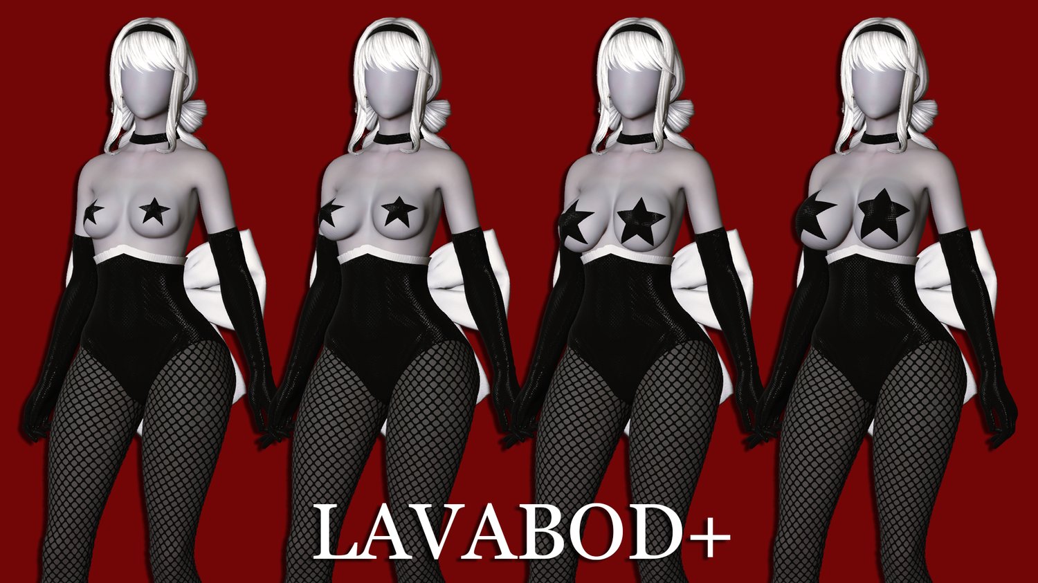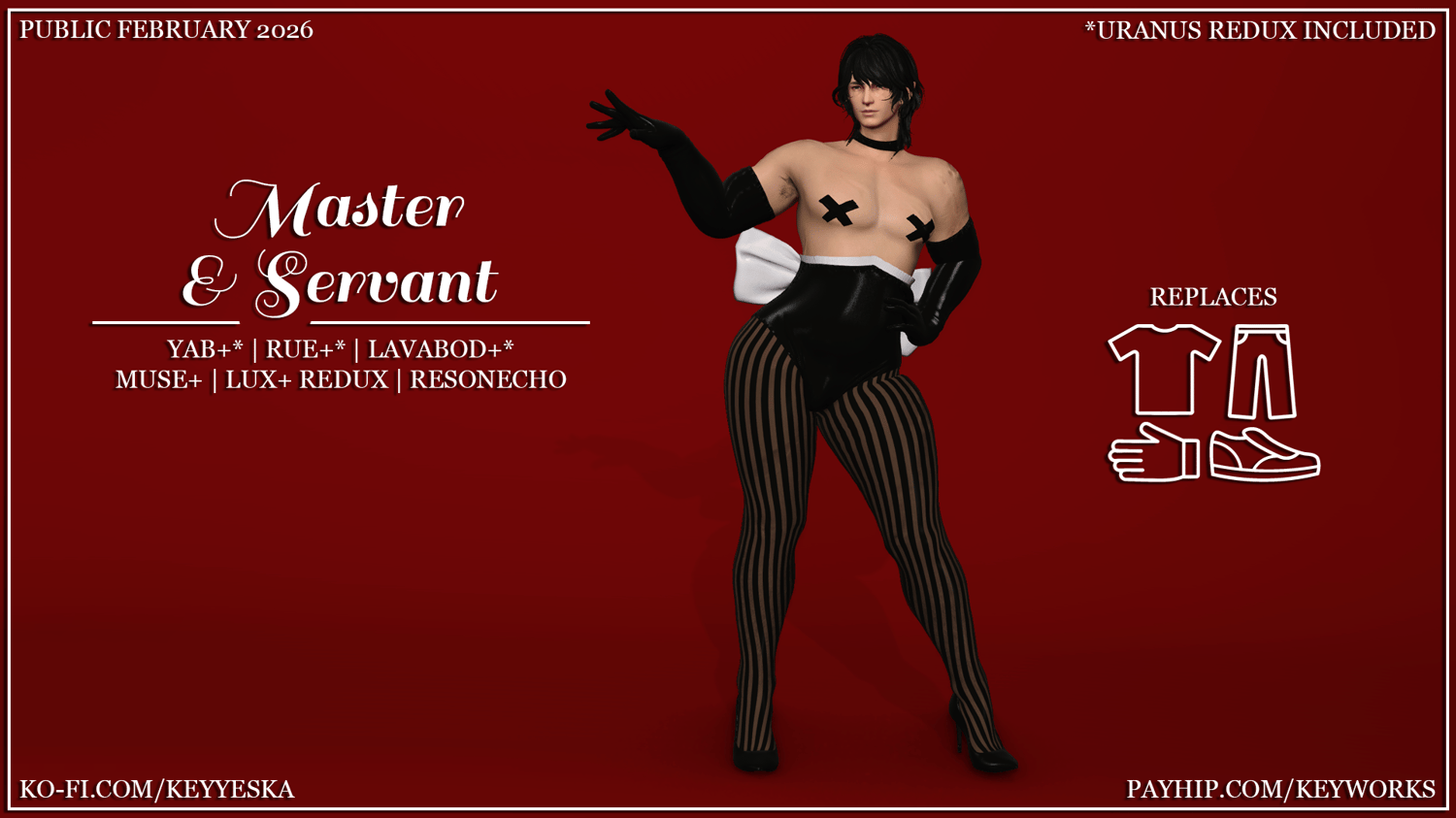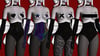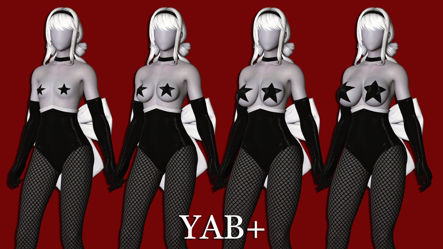 Set is assembled of pasties with a choker, half bodycon suit with tights, firm gloves, and stiletto heels. There are three shader options for the overall bodysuit, four patterns for tights, three pasty patterns, toggles, dual dyeability, and auto adjustment for heels.
