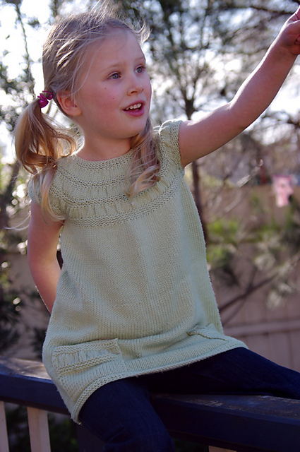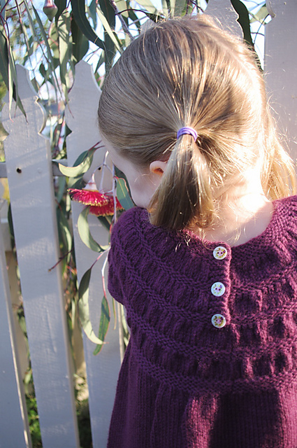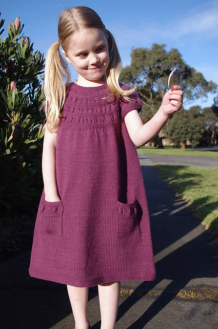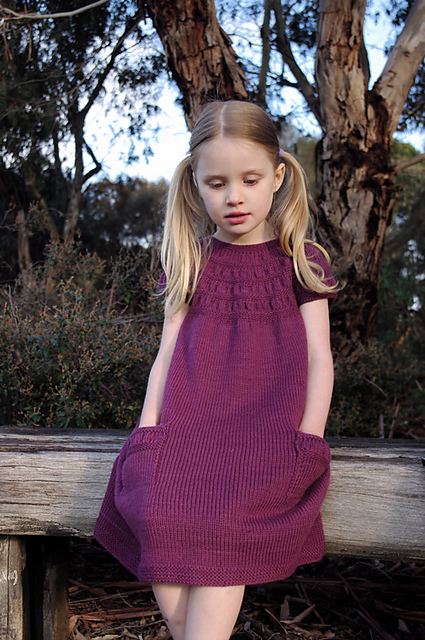 This delightful dress is knit from the top down beginning with a flat back-buttoning yoke featuring three buttons. Once the yoke is joined, the rest of the dress is knit seamlessly with the armbands also knit in the round. The patch pockets are picked up from the body of the garment and sewn into place, once knit.