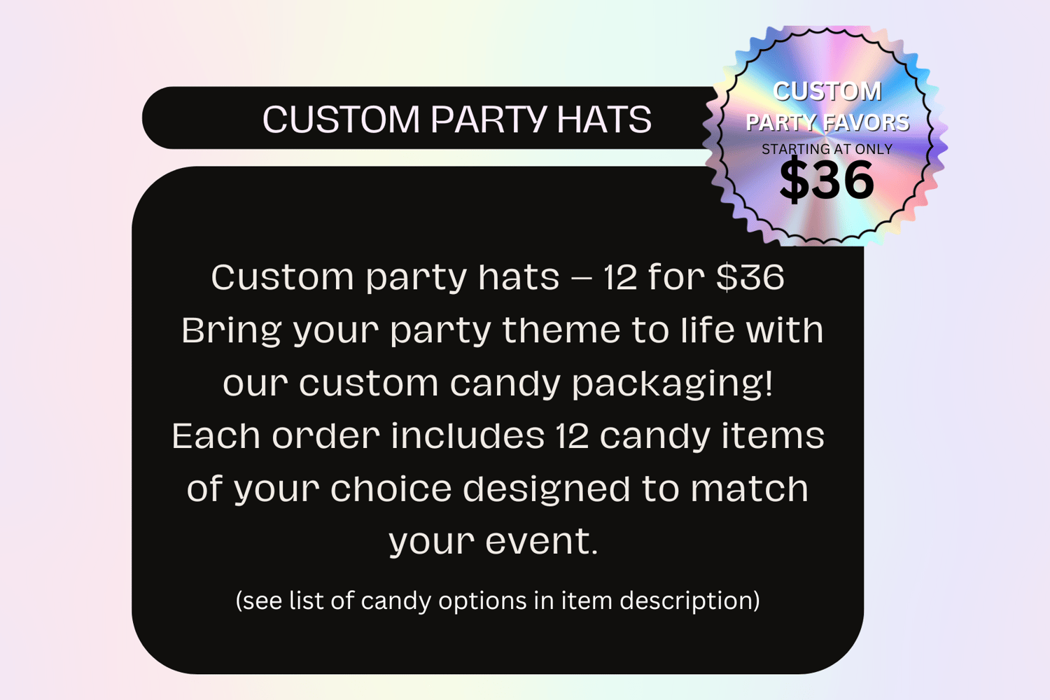 Add the perfect touch of glam to your event with our custom-designed party hats! Each order includes 12 personalized party hats for $36, created to match your theme and make your party unforgettable.