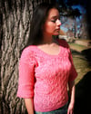 Tee is boxy, and designed to be quite loose, or not. The tee shown is the second smallest size, and though it was designed to fit a 33-inch chest, it looks lovely on the model’s 36-inch frame. Because of the stretchy nature of knitting, this same sweater also fits my 40-inch (ish) chest nicely giving a more fitted look, because of the negative ease.
