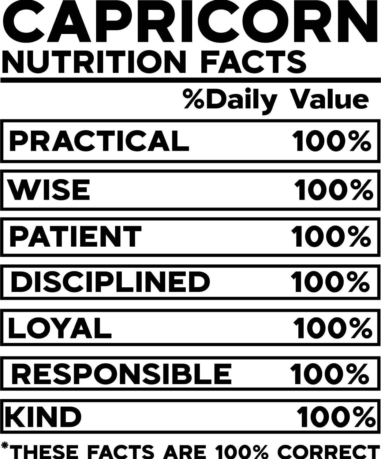 Highlight the hardworking, ambitious nature of a Capricorn with this “Capricorn Nutrition Facts” design. Perfectly structured to match Capricorn’s disciplined energy.