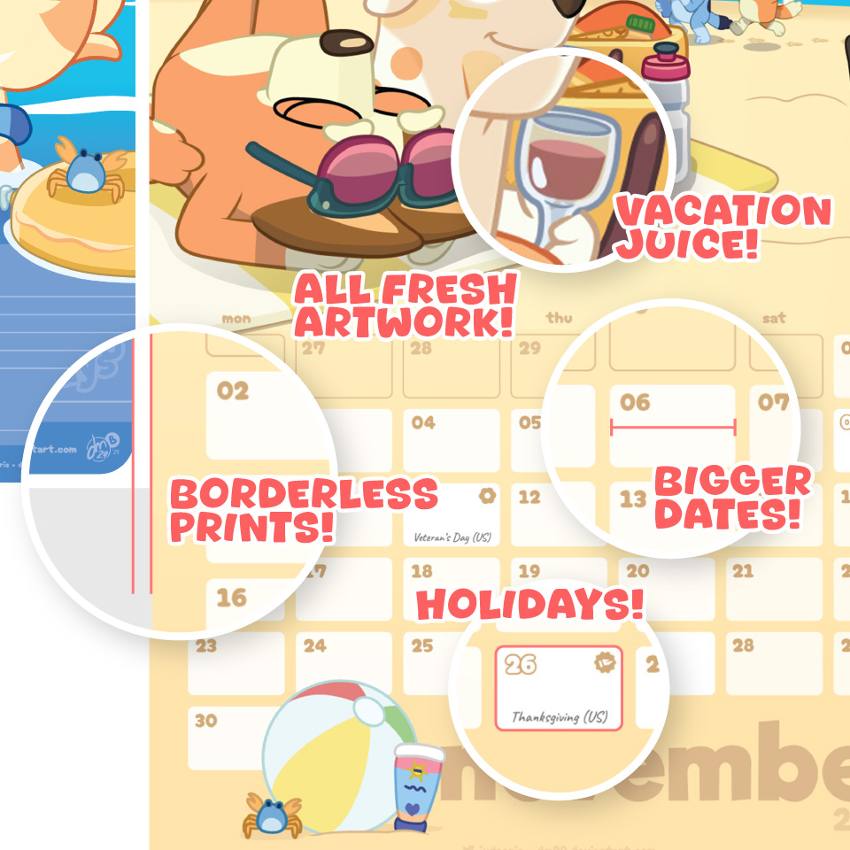 Artwork is suitable for a general audience, but contains implied references to drinking (y'know, "vacation juice"), without its effects depicted. For a taste of what to expect, check out the 2025 calendar.