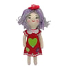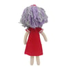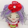 Papusa cu par scurt mov, cu rochie rosie, din fetru