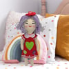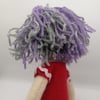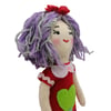 Papusa cu par scurt mov, cu rochie rosie, din fetru, handmade
